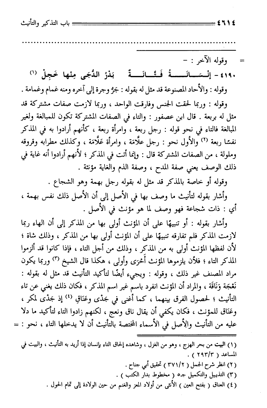 وأشار بقوله لتأنيث ما وصف بها في الأصل إلى أن الأصل ذلك نفس بهمة، أي: ذات شجاعة فهو وصف لما هو مؤنث في الأصل.