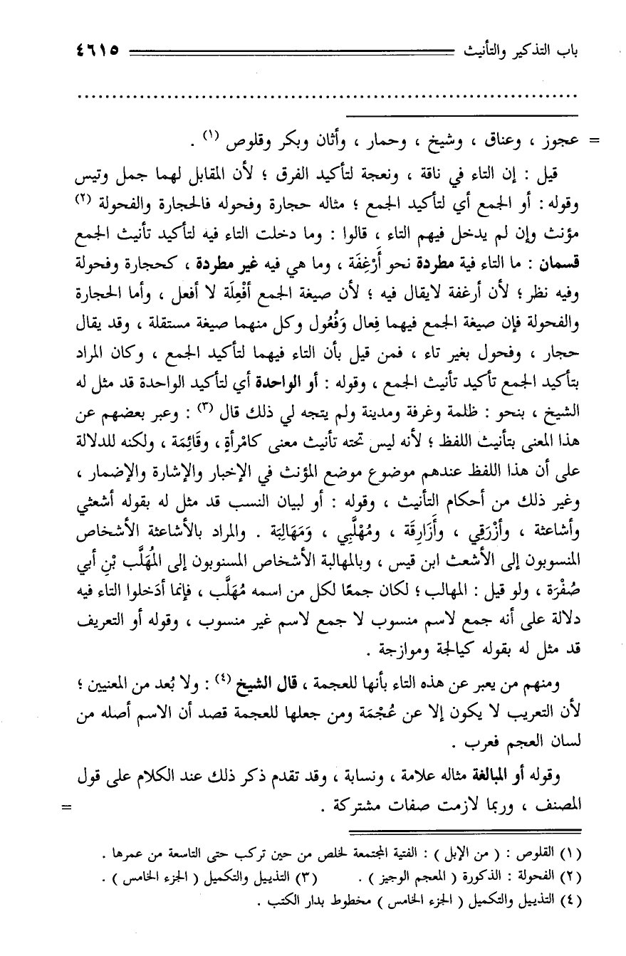 قيل: إن التاء في ناقة، ونعجة لتأكيد الفرق؛ لأن المقابل لهما جمل وتيس وقوله: أو الجمع أي لتأكيد الجمع؛ مثاله حجارة وفحوله فالحجارة والفحولة (¬2) مؤنث وإن لم يدخل فيهم التاء، قالوا: وما دخلت التاء فيه لتأكيد تأنيث الجمع قسمان: ما التاء فية مطردة نحو أرغفة، وما هي فيه غير مطردة، كحجارة وفحولة وفيه نظر؛ لأن أرغفة لا يقال فيه؛ لأن صيغة الجمع أفعلة لا أفعل، وأما الحجارة والفحولة فإن صيغة الجمع فيهما فعال وفعول وكل منهما صيغة مستقلة، وقد يقال حجار، وفحول بغير تاء، فمن قيل بأن التاء فيهما لتأكيد الجمع، وكان المراد بتأكيد الجمع تأكيد تأنيث الجمع، وقوله: أو الواحدة أي لتأكيد الواحدة قد مثل له الشيخ، بنحو: ظلمة وغرفة ومدينة ولم يتجه لي ذلك قال (¬3): وعبر بعضهم عن هذا المعنى بتأنيث اللفظ؛ لأنه ليس تحته تأنيث معنى كامرأة، وقائمة، ولكنه للدلالة على أن هذا اللفظ عندهم موضوع موضع المؤنث في الإخبار والإشارة والإضمار، وغير ذلك من أحكام التأنيث، وقوله: أو لبيان النسب قد مثل له بقوله أشعثي وأشاعثة، وأزرقي، وأزارقة، ومهلّبي، ومهالبة. والمراد بالأشاعثة الأشخاص المنسوبون إلى الأشعث ابن قيس، وبالمهالبة الأشخاص المنسوبون إلى المهلّب بن أبي صفرة، ولو قيل: المهالب؛ لكان جمعا لكل من اسمه مهلّب، فإنما أدخلوا التاء فيه دلالة على أنه جمع لاسم منسوب لا جمع لاسم غير منسوب، وقوله أو التعريف قد مثل له بقوله كيالجة وموازجة.