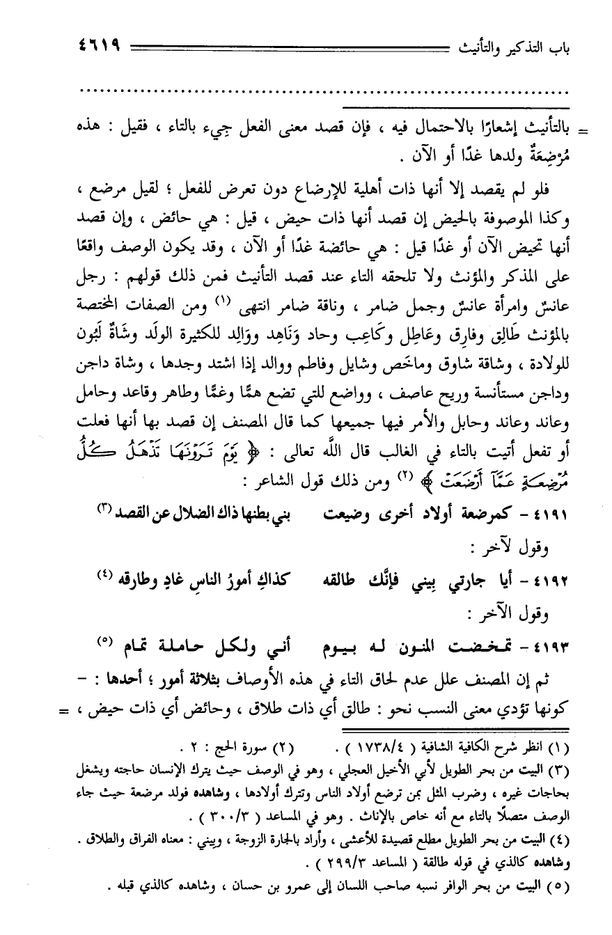(¬3) البيت من بحر الطويل لأبي الأخيل العجلي، وهو في الوصف حيث يترك الإنسان حاجته ويشغل بحاجات غيره، وضرب المثل بمن ترضع أولاد الناس وتترك أولادها، وشاهده فولد مرضعة حيث جاء الوصف متصلا بالتاء مع أنه خاص بالإناث. وهو في المساعد (3/ 300).