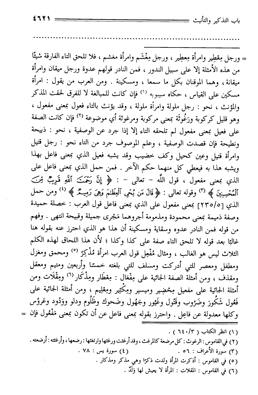 ورجل معطير وامرأة معطير، ورجل مغشم وامرأة مغشم، فلا تلحق التاء الفارقة شيئا من هذه الأمثلة إلا على سبيل الندور، فمن النادر قولهم عدوة ورجل ميقان وامرأة ميقانة، وهما الموقنان بكل ما سمعا، ومسكينة. ومن العرب من يقول: امرأة مسكين على القياس، حكاه سيبويه (¬1) فإن كانت للمبالغة لا للفرق لحقت المذكر والمؤنث، نحو: رجل ملولة وامرأة ملولة، وقد يؤنث بالتاء فعول بمعنى مفعول، وهو قليل كركوبة ورغوثة بمعنى مركوبة ومرغوثة أي موضوعة (¬2) فإن كانت الصفة على فعيل بمعنى مفعول لم تلحقه التاء إلا إذا جرد عن الوصفية، نحو: ذبيحة ونطيحة فإن قصدت الوصفية، وعلم الموصوف جرد من التاء نحو: رجل قتيل وامرأة قتيل وعين كحيل وكف خضيب وقد يشبه فعيل الذي بمعنى فاعل بهذا ويشبه هذا به فيعطي كل منهما حكم الآخر. فمن حمل الذي بمعنى فاعل على الذي بمعنى مفعول، قول الله - تعالى -: إِنَّ رَحْمَتَ اللَّهِ قَرِيبٌ مِنَ الْمُحْسِنِينَ (¬3) وقوله تعالى: قالَ مَنْ يُحْيِ الْعِظامَ وَهِيَ رَمِيمٌ (¬4) ومن حمل الذي [5/ 235] بمعنى مفعول على الذي بمعنى فاعل قول العرب: خصلة حميدة وصفة ذميمة بمعنى محمودة ومذمومة أجروهما مجرى جميلة وقبيحة انتهى. وفهم من قوله فمن النادر عدوه وسقاية ومسكينة أن هذا هو الذي احترز عنه بقوله هنا غالبا بعد قوله لا تلحق التاء صفة على كذا وكذا؛ لأن هذا اللحاق لهذه الكلم الثلاث ليس هو الغالب، ومثال مفعل قول العرب امرأة مذكر (¬5) ومحمق ومغزل ومطفل ومعصر للتي أدركت ومسلف للتي بلغته خمسا وأربعين ومتيم ومعقل ومقذف، ومن أمثلة الصفة الجائية على مفعال: معطار ومذكار (¬6) ومقلات ومن أمثلة الجائية على مفعيل محضير وميسير ومكثير ومعليم، ومن أمثلة الجائية على فعول شكور وضروب وقتول وغيور وجهول وضحوك وظلوم ودلو وودود وعروس وكلها معدولة عن فاعل. واحترز بقوله بمعنى فاعل عن أن تكون بمعنى مفعول فإن -