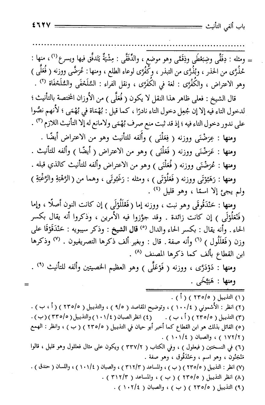 قال الشيخ: فعلى ظاهر هذا النقل لا يكون (فعلّى) من الأوزان المختصة بالتأنيث؛ لدخول التاء فيه إلا إن جعل دخول التاء نادرا، كما قيل: بهماة في بهمى؛ لأنهم نصّوا على ندور دخول التاء فيه؛ إذ قد ثبت منع صرف بهمى ولا مانع له إلا التأنيث اللازم (¬3).