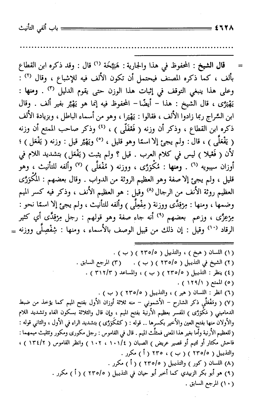 (¬7) (ومفعلّى ذكر الشارح - الأشموني - منه ثلاثة أوزان الأول بفتح الميم كما يؤخذ من ضبط الدماميني (مكورّى) المفسر بعظيم الأرنبة بفتح الميم، وإن قال والثلاثة بسكون الفاء وتشديد اللام والأولان منها بفتح العين والأخير بكسرها ... قوله: (كمكورّى) بتشديد الراء في الأول، والثاني قوله: