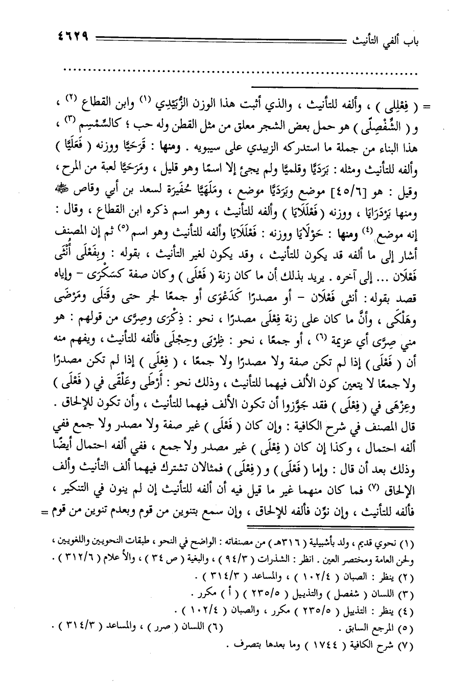 (فعللى)، وألفه للتأنيث، والذي أثبت هذا الوزن الزّبيدي (¬1) وابن القطاع (¬2)، و (الشّفصلّى) هو حمل بعض الشجر معلق من مثل القطن وله حب؛ كالسّمسم (¬3)، هذا البناء من جملة ما استدركه الزبيدي على سيبويه. ومنها: قرحيّا ووزنه (فعليّا) وألفه للتأنيث ومثله: برديّا وقلميّا ولم يجئ إلا اسما وهو قليل، ومرحيّا لعبة من المرح، وقيل: هو [6/ 45] موضع وبرديّا موضع، وملهيّا حفيرة لسعد بن أبي وقاص رضي الله عنه ومنها بردرايا، ووزنه (فعللايا) وألفه للتأنيث، وهو اسم ذكره ابن القطاع، وقال: