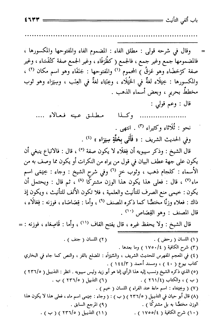 وقال في شرحه قولى: مطلق الفاء: المضموم الفاء والمفتوحها والمكسورها، فالمضمومها جمع وغير جمع، فالجمع (كظرفاء، وغير الجمع صفة كنفساء، وغير صفة كرحضاء وهو عرق) المحموم (¬1) والمفتوحها: جنفاء وهو اسم مكان (¬2)، والمكسورها: خيلاء لغة في الخيلاء، وعنباء لغة في العنب، وسيراء وهو ثوب مخطط بحرير، وبعض أسماء الذهب.