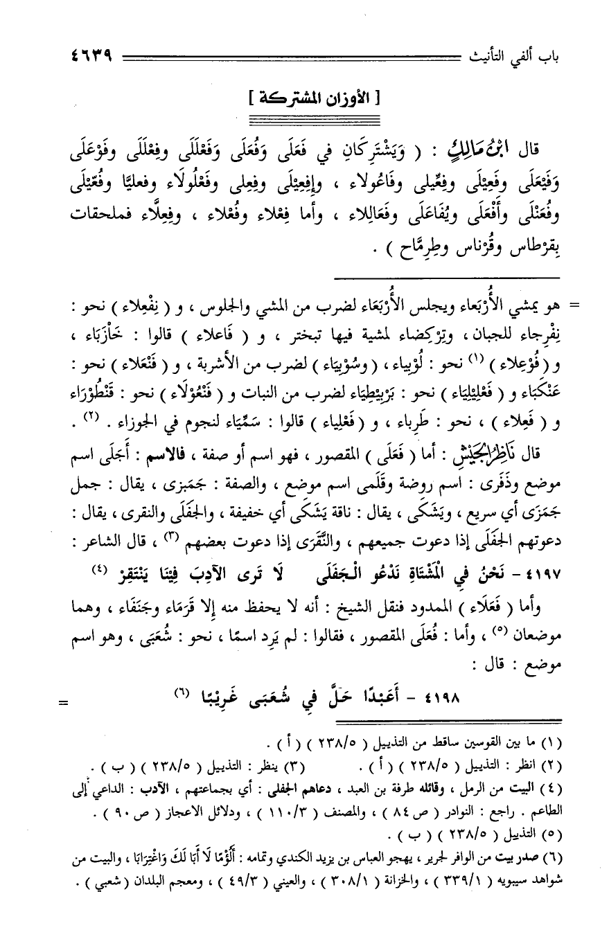 قال ابن مالك: (ويشتركان في فعلى وفعلى وفعللى وفعللى وفوعلى وفيعلى وفعيلى وفعّيلى وفاعولاء، وإفعيلى وفعلى وفعلولاء وفعليّا وفعّيلى وفعنلى وأفعلى ويفاعلى وفعاللاء، وأما فعلاء وفعلاء، وفعلّاء فملحقات بقرطاس وقرناس وطرمّاح).