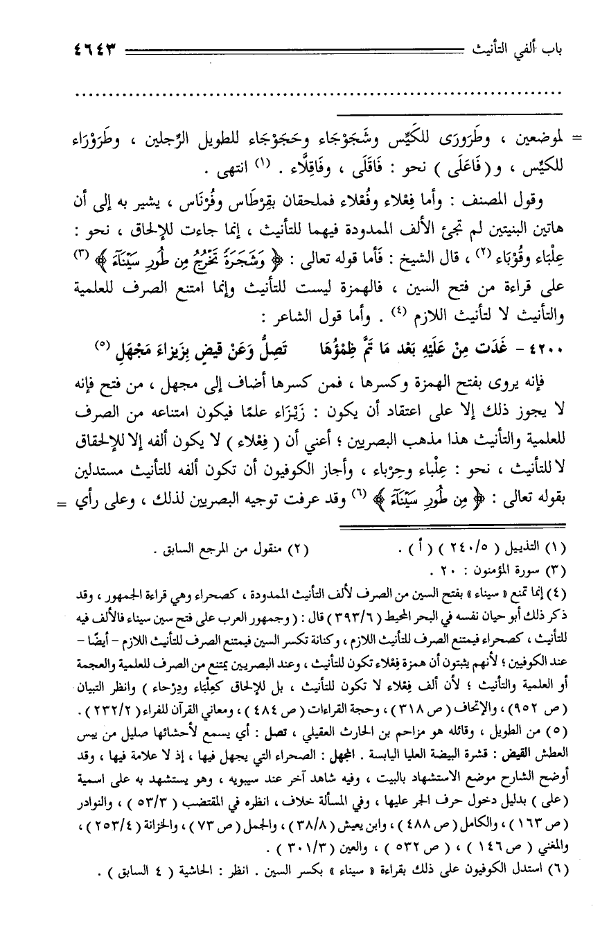 علباء وقوباء (¬2)، قال الشيخ: فأما قوله تعالى: وَشَجَرَةً تَخْرُجُ مِنْ طُورِ سَيْناءَ (¬3) على قراءة من فتح السين، فالهمزة ليست للتأنيث وإنما امتنع الصرف للعلمية والتأنيث لا لتأنيث اللازم (¬4). وأما قول الشاعر: