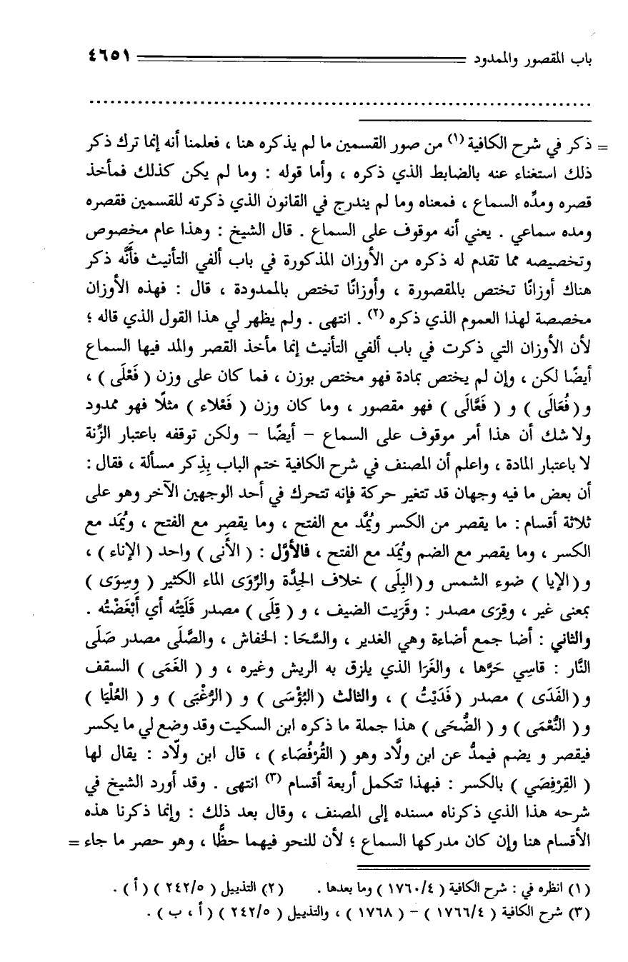 والثاني: أضا جمع أضاءة وهي الغدير، والسّحا: الخفاش، والصّلى مصدر صلى النّار: قاسي حرّها، والغرا الذي يلزق به الريش وغيره، و (الغمى) السقف و (الفدى) مصدر (فديت)، والثالث (البؤسى) و (الرّغبى) و (العليا) و (النّعمى) و (الضّحى) هذا جملة ما ذكره ابن السكيت وقد وضع لي ما يكسر فيقصر ويضم فيمدّ عن ابن ولّاد وهو (القرفصاء)، قال ابن ولّاد: يقال لها (القرفصي) بالكسر: فبهذا تتكمل أربعة أقسام (¬3) انتهى. وقد أورد الشيخ في شرحه هذا الذي ذكرناه مسنده إلى المصنف، وقال بعد ذلك: وإنما ذكرنا هذه الأقسام هنا وإن كان مدركها السماع؛ لأن للنحو فيهما حظّا، وهو حصر ما جاء -