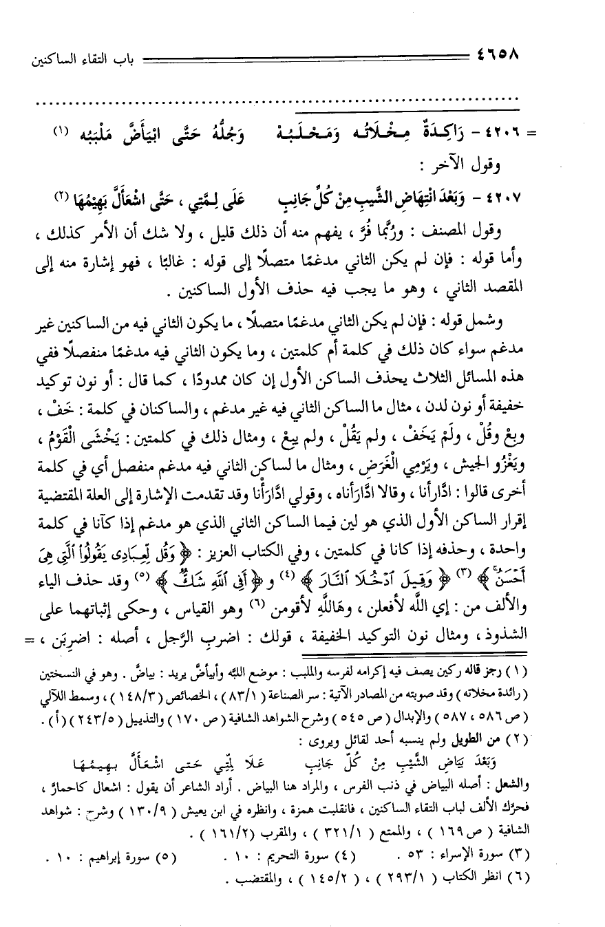 وشمل قوله: فإن لم يكن الثاني مدغما متصلا، ما يكون الثاني فيه من الساكنين غير مدغم سواء كان ذلك في كلمة أم كلمتين، وما يكون الثاني فيه مدغما منفصلا ففي هذه المسائل الثلاث يحذف الساكن الأول إن كان ممدودا، كما قال: أو نون توكيد خفيفة أو نون لدن، مثال ما الساكن الثاني فيه غير مدغم، والساكنان في كلمة: خف، وبع وقل، ولم يخف، ولم يقل، ولم يبع، ومثال ذلك في كلمتين: يخشى القوم، ويغزو الجيش، ويرمي الغرض، ومثال ما لساكن الثاني فيه مدغم منفصل أي في كلمة أخرى قالوا: ادّارأنا، وقالا ادّارأناه، وقولي ادّارأنا وقد تقدمت الإشارة إلى العلة المقتضية إقرار الساكن الأول الذي هو لين فيما الساكن الثاني الذي هو مدغم إذا كآنا في كلمة واحدة، وحذفه إذا كانا في كلمتين، وفي الكتاب العزيز: وَقُلْ لِعِبادِي يَقُولُوا الَّتِي هِيَ أَحْسَنُ (¬3) وَقِيلَ ادْخُلَا النَّارَ (¬4) وأَ فِي اللَّهِ شَكٌّ (¬5) وقد حذف الياء والألف من: إي الله لأفعلن، وهالله لأقومن (¬6) وهو القياس، وحكى إثباتهما على الشذوذ، ومثال نون التوكيد الخفيفة، قولك: اضرب الرّجل، أصله: اضربن، -