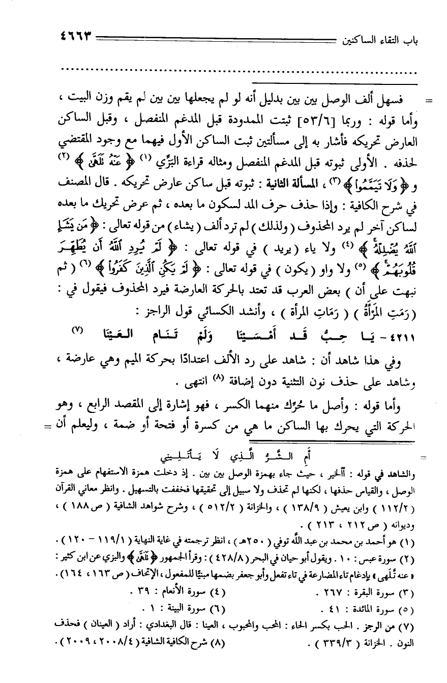 فسهل ألف الوصل بين بين بدليل أنه لو لم يجعلها بين بين لم يقم وزن البيت، وأما قوله: وربما [6/ 53] ثبتت الممدودة قبل المدغم المنفصل، وقبل الساكن العارض تحريكه فأشار به إلى مسألتين ثبت الساكن الأول فيهما مع وجود المقتضي لحذفه. الأولى ثبوته قبل المدغم المنفصل ومثاله قراءة البزّي (¬1) عنه تلهى (¬2) ووَ لا تَيَمَّمُوا (¬3)، المسألة الثانية: ثبوته قبل ساكن عارض تحريكه. قال المصنف في شرح الكافية: وإذا حذف حرف المد لسكون ما بعده، ثم عرض تحريك ما بعده لساكن آخر لم يرد المحذوف (ولذلك) لم ترد ألف (يشاء) من قوله تعالى: مَنْ يَشَأِ اللَّهُ يُضْلِلْهُ (¬4) ولا ياء (يريد) في قوله تعالى: لَمْ يُرِدِ اللَّهُ أَنْ يُطَهِّرَ قُلُوبَهُمْ (¬5) ولا واو (يكون) في قوله تعالى: لَمْ يَكُنِ الَّذِينَ كَفَرُوا (¬6) (ثم نبهت على أن) بعض العرب قد تعتد بالحركة العارضة فيرد المحذوف فيقول في:
