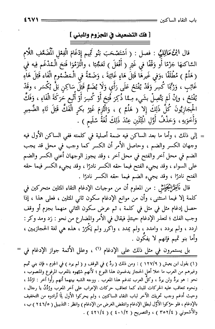 (¬1) يقول ابن يعيش (9/ 127): ومن ذلك (ردّ) في الوقف و (لم يرد) في الجزم، فإن بني تميم وغيرهم من العرب ما خلا أهل الحجاز يدغمون هذا النوع؛ لأنهم شبّهوه بالمعرب المرفوع والمنصوب، نحو: هو يردّ ولن يردّ، وكلّ العرب تدغم هذا المعرب. ووجه الشبه بينهما أنهم رأوا آخر: اردد، ونحوه تتعاقب عليه الحركات للبناء كما تتعاقب حركات الإعراب على آخر المعرب وردّنّ يا رجال، وحيث أدغم وجب تحريك الآخر لباب التقاء الساكنين، ولم يحركوا الأول لما أرادوه من التخفيف بالإدغام، فلو حرّكوا الأوّل لبطل الإدغام وانتقض الغرض من الإدغام) وانظر: التذييل (5/ 246) ب، والأشموني (4/ 352)، والتصريح (2/ 401) (4/ 421).