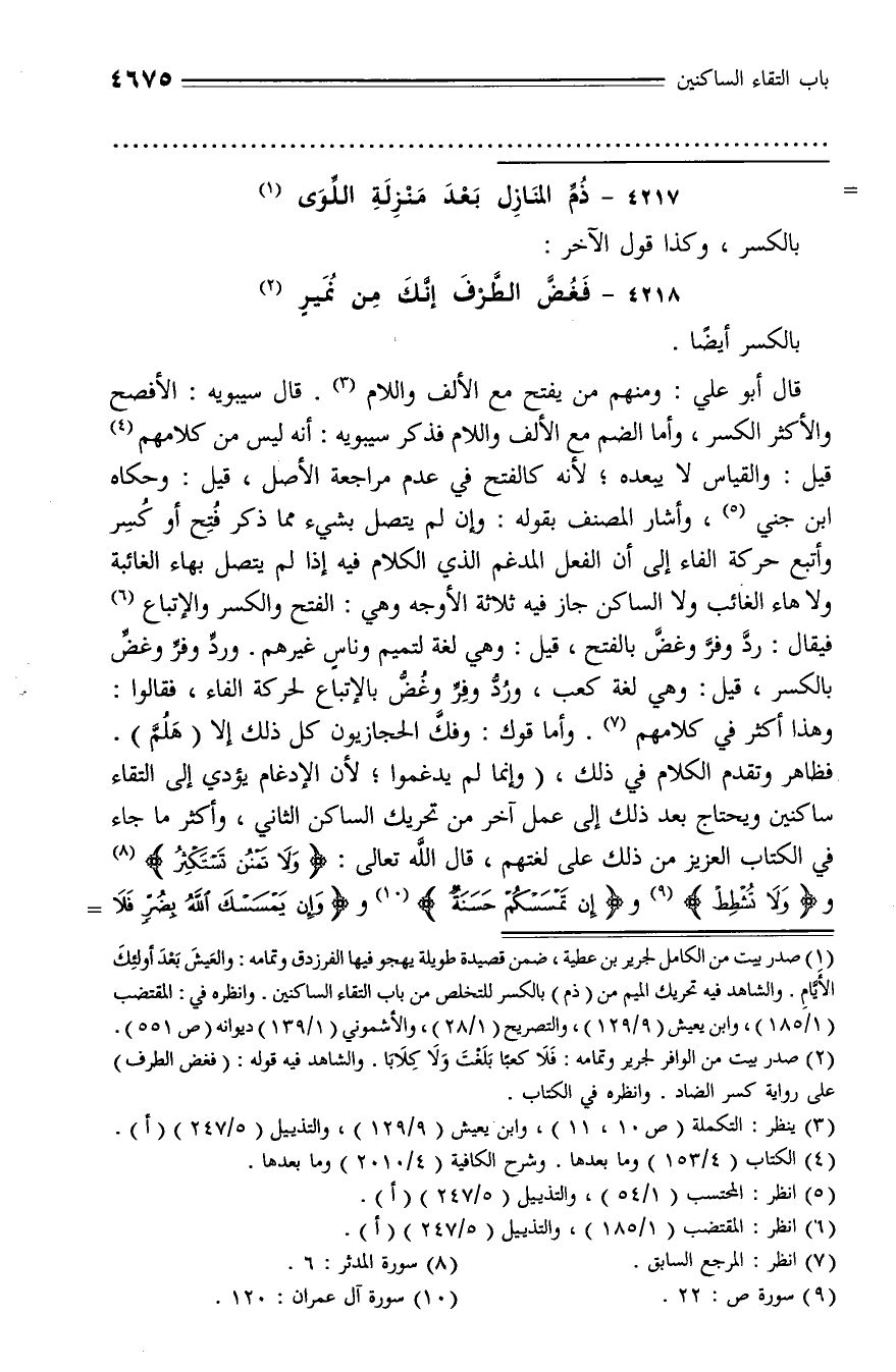 فظاهر وتقدم الكلام في ذلك، (وإنما لم يدغموا؛ لأن الإدغام يؤدي إلى التقاء ساكنين ويحتاج بعد ذلك إلى عمل آخر من تحريك الساكن الثاني، وأكثر ما جاء في الكتاب العزيز من ذلك على لغتهم، قال الله تعالى: وَلا تَمْنُنْ تَسْتَكْثِرُ (¬8) ووَ لا تُشْطِطْ (¬9) وإِنْ تَمْسَسْكُمْ حَسَنَةٌ (¬10) ووَ إِنْ يَمْسَسْكَ اللَّهُ بِضُرٍّ فَلا -