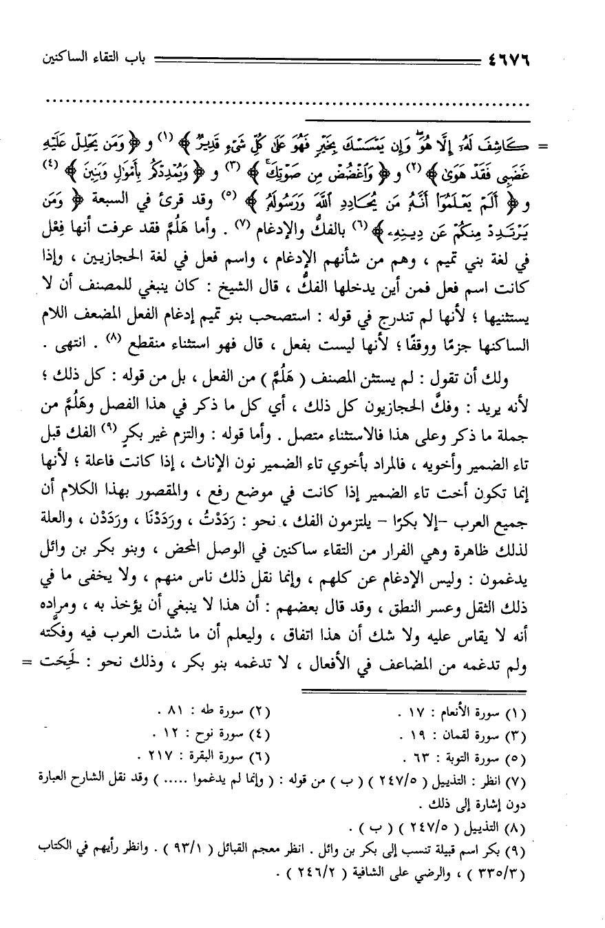 كاشِفَ لَهُ إِلَّا هُوَ وَإِنْ يَمْسَسْكَ بِخَيْرٍ فَهُوَ عَلى كُلِّ شَيْءٍ قَدِيرٌ (¬1) ووَ مَنْ يَحْلِلْ عَلَيْهِ غَضَبِي فَقَدْ هَوى (¬2) ووَ اغْضُضْ مِنْ صَوْتِكَ (¬3) ووَ يُمْدِدْكُمْ بِأَمْوالٍ وَبَنِينَ (¬4) وأَ لَمْ يَعْلَمُوا أَنَّهُ مَنْ يُحادِدِ اللَّهَ وَرَسُولَهُ (¬5) وقد قرئ في السبعة وَمَنْ يَرْتَدِدْ مِنْكُمْ عَنْ دِينِهِ (¬6) بالفكّ والإدغام (¬7). وأما هلمّ فقد عرفت أنها فعل في لغة بني تميم، وهم من شأنهم الإدغام، واسم فعل في لغة الحجازيين، وإذا كانت اسم فعل فمن أين يدخلها الفكّ، قال الشيخ: كان ينبغي للمصنف أن لا يستثنيها؛ لأنها لم تندرج في قوله: استصحب بنو تميم إدغام الفعل المضعف اللام الساكنها جزما ووقفا؛ لأنها ليست بفعل، قال فهو استثناء منقطع (¬8). انتهى.