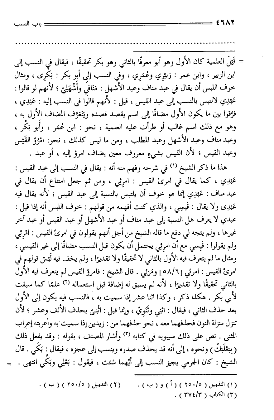 قيل العلمية كان الأول وهو أبو معرفا بالثاني وهو بكر تحقيقا، فيقال في النسب إلى ابن الزبير، وابن عمر: زبيري وعمري، وفي النسب إلى أبو بكر: بكرى، ومثال خوف اللبس أن يقال في عبد مناف وعبد الأشهل: منافي وأشهليّ؛ لأنهم لو قالوا: