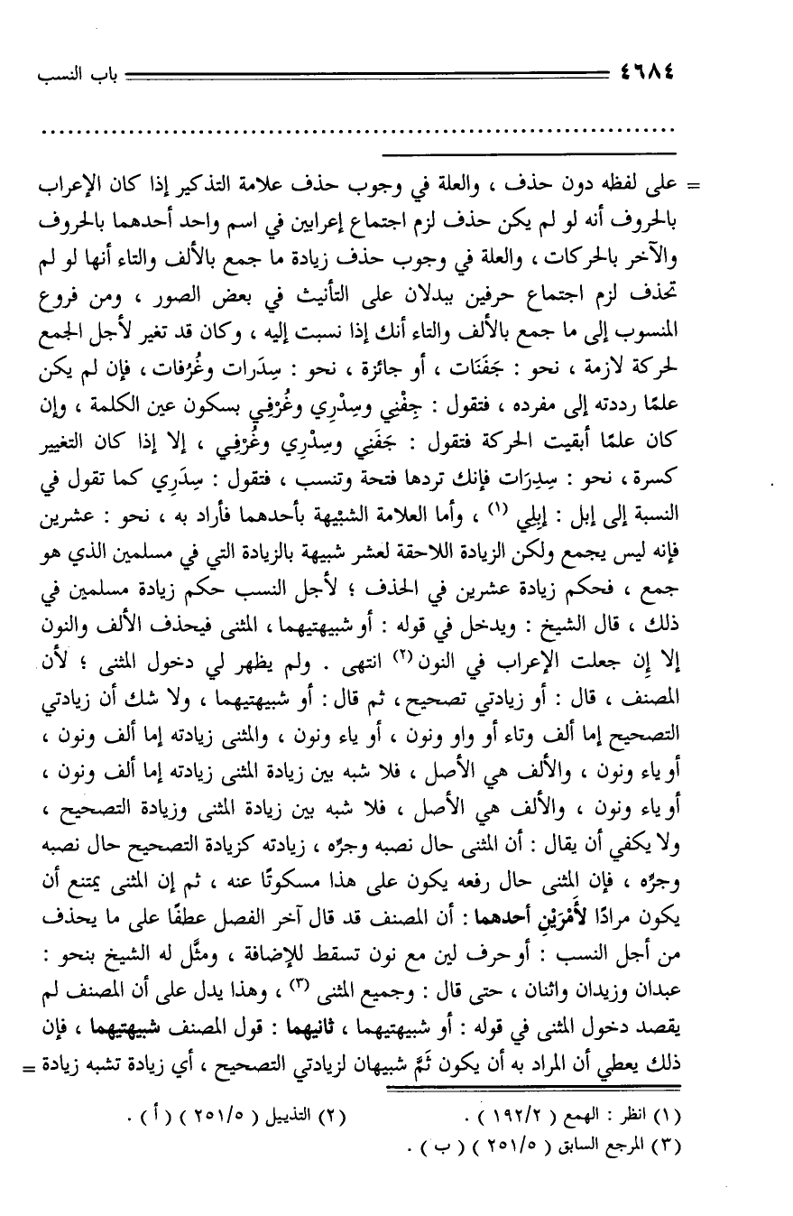 على لفظه دون حذف، والعلة في وجوب حذف علامة التذكير إذا كان الإعراب بالحروف أنه لو لم يكن حذف لزم اجتماع إعرابين في اسم واحد أحدهما بالحروف والآخر بالحركات، والعلة في وجوب حذف زيادة ما جمع بالألف والتاء أنها لو لم تحذف لزم اجتماع حرفين ببدلان على التأنيث في بعض الصور، ومن فروع المنسوب إلى ما جمع بالألف والتاء أنك إذا نسبت إليه، وكان قد تغير لأجل الجمع لحركة لازمة، نحو: جفنات، أو جائزة، نحو: سدرات وغرفات، فإن لم يكن علما رددته إلى مفرده، فتقول: جفني وسدري وغرفي بسكون عين الكلمة، وإن كان علما أبقيت الحركة فتقول: جفني وسدري وغرفي، إلا إذا كان التغيير كسرة، نحو: سدرات فإنك تردها فتحة وتنسب، فتقول: سدري كما تقول في النسبة إلى إبل: إبلي (¬1)، وأما العلامة الشبيهة بأحدهما فأراد به، نحو: عشرين فإنه ليس يجمع ولكن الزيادة اللاحقة لعشر شبيهة بالزيادة التي في مسلمين الذي هو جمع، فحكم زيادة عشرين في الحذف؛ لأجل النسب حكم زيادة مسلمين في ذلك، قال الشيخ: ويدخل في قوله: أو شبيهتيهما، المثنى فيحذف الألف والنون إلا إن جعلت الإعراب في النون (¬2) انتهى. ولم يظهر لي دخول المثنى؛ لأن المصنف، قال: أو زيادتي تصحيح، ثم قال: أو شبيهتيهما، ولا شك أن زيادتي التصحيح إما ألف وتاء أو واو ونون، أو ياء ونون، والمثنى زيادته إما ألف ونون، أو ياء ونون، والألف هي الأصل، فلا شبه بين زيادة المثنى زيادته إما ألف ونون، أو ياء ونون، والألف هي الأصل، فلا شبه بين زيادة المثنى وزيادة التصحيح، ولا يكفي أن يقال: أن المثنى حال نصبه وجرّه، زيادته كزيادة التصحيح حال نصبه وجرّه، فإن المثنى حال رفعه يكون على هذا مسكوتا عنه، ثم إن المثنى يمتنع أن يكون مرادا لأمرين أحدهما: أن المصنف قد قال آخر الفصل عطفا على ما يحذف من أجل النسب: أو حرف لين مع نون تسقط للإضافة، ومثّل له الشيخ بنحو: