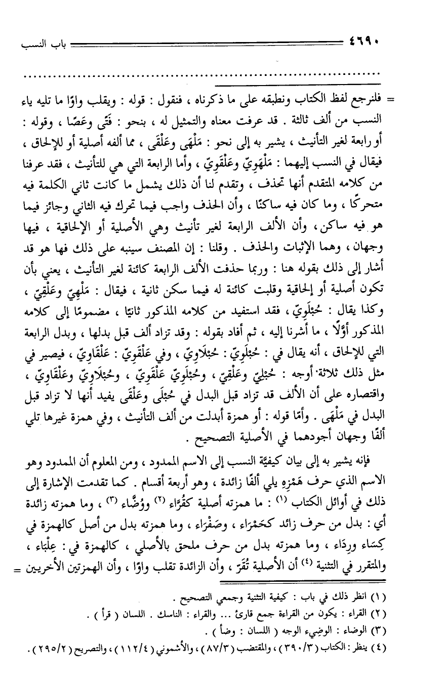 فإنه يشير به إلى بيان كيفيّة النسب إلى الاسم الممدود، ومن المعلوم أن الممدود وهو الاسم الذي حرف همزه يلي ألفا زائدة، وهو أربعة أقسام. كما تقدمت الإشارة إلى ذلك في أوائل الكتاب (¬1): ما همزته أصلية كقرّاء (¬2) ووضّاء (¬3)، وما همزته زائدة أي: بدل من حرف زائد كحمراء، وصفراء، وما همزته بدل من أصل كالهمزة في كساء ورداء، وما همزته بدل من حرف ملحق بالأصلي، كالهمزة في: علباء، والمتقرر في التثنية (¬4) أن الأصلية تقرّ، وأن الزائدة تقلب واوا، وأن الهمزتين الأخريين -
