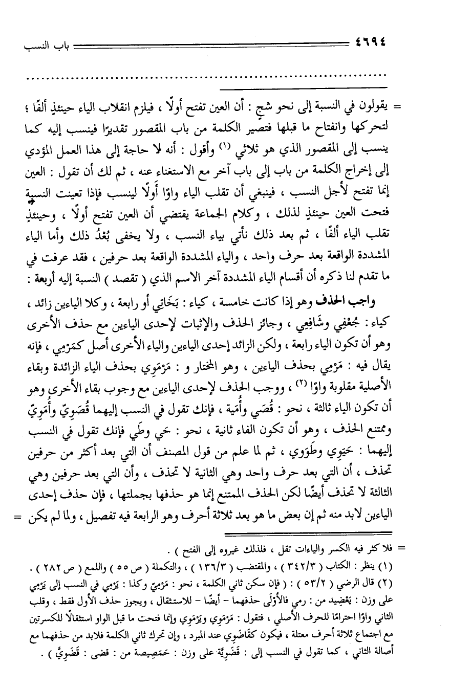 (¬2) قال الرضي (2/ 53): (فإن سكن ثاني الكلمة، نحو: مرميّ وكذا: يرمي في النسب إلى يرمي على وزن: يعضيد من: رمي فالأولى حذفهما - أيضا - للاستثقال، ويجوز حذف الأول فقط، وقلب الثاني واوا احتراما للحرف الأصلي، فتقول: مرموي ويرموي وإنما فتحت ما قبل الواو استثقالا للكسرتين مع اجتماع ثلاثة أحرف معتلة، فيكون كقاضوي عند المبرد، وإن تحرك ثاني الكلمة فلا بد من حذفهما مع أصالة الثاني،