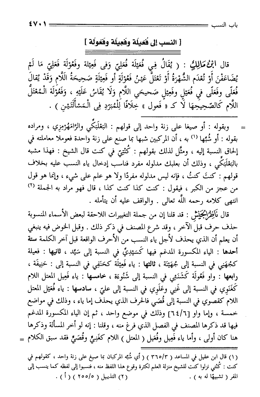 (¬1) قال ابن عقيل في المساعد (3/ 365) (أي شبّه المركبان بما صيغ على زنة واحد، كقولهم في كنت: كنتي نزلوا كنت للشيخ منزلة العلم لكثرة وقوع هذا اللفظ منه، فنسبوا إلى لفظه كما ينسب إلى المفر (تشبيها له به).