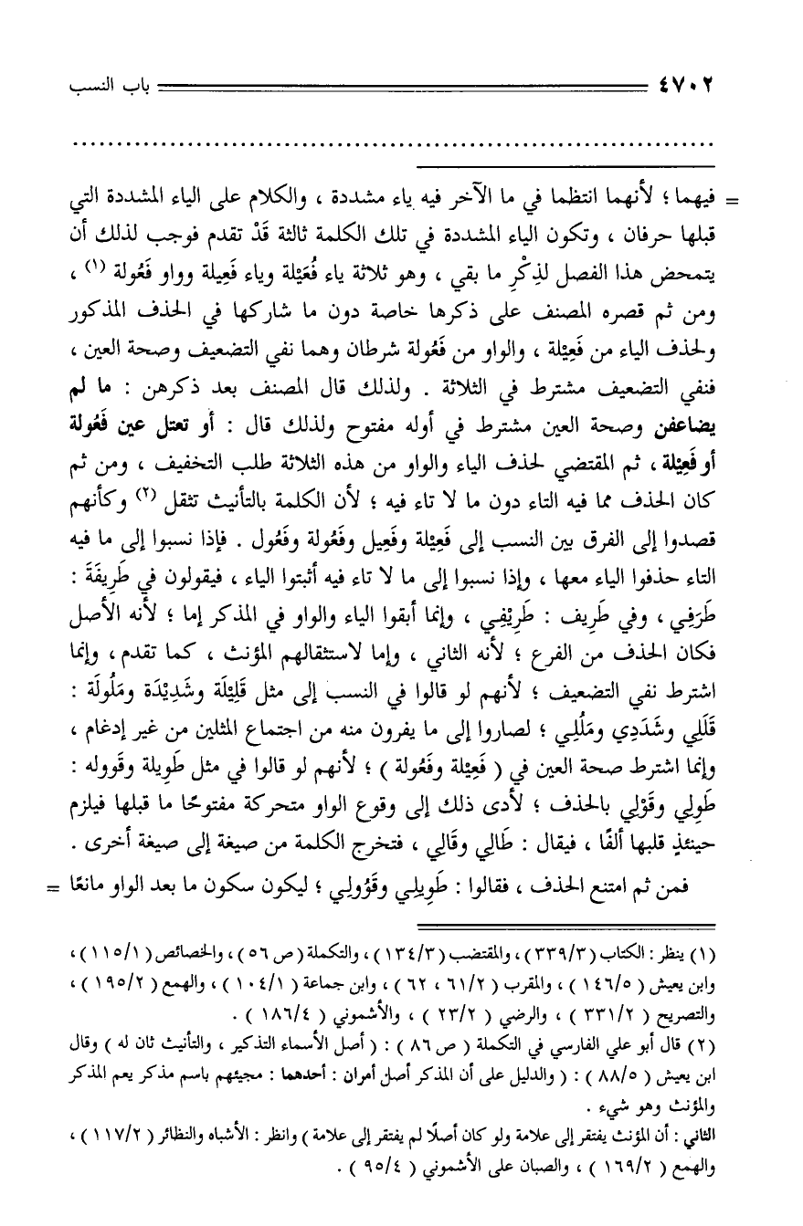 فيهما؛ لأنهما انتظما في ما الآخر فيه ياء مشددة، والكلام على الياء المشددة التي قبلها حرفان، وتكون الياء المشددة في تلك الكلمة ثالثة قد تقدم فوجب لذلك أن يتمحض هذا الفصل لذكر ما بقي، وهو ثلاثة ياء فعيلة وياء فعيلة وواو فعولة (¬1)، ومن ثم قصره المصنف على ذكرها خاصة دون ما شاركها في الحذف المذكور ولحذف الياء من فعيلة، والواو من فعولة شرطان وهما نفي التضعيف وصحة العين، فنفي التضعيف مشترط في الثلاثة. ولذلك قال المصنف بعد ذكرهن: ما لم يضاعفن وصحة العين مشترط في أوله مفتوح ولذلك قال: أو تعتل عين فعولة أو فعيلة، ثم المقتضي لحذف الياء والواو من هذه الثلاثة طلب التخفيف، ومن ثم كان الحذف مما فيه التاء دون ما لا تاء فيه؛ لأن الكلمة بالتأنيث تثقل (¬2) وكأنهم قصدوا إلى الفرق بين النسب إلى فعيلة وفعيل وفعولة وفعول. فإذا نسبوا إلى ما فيه التاء حذفوا الياء معها، وإذا نسبوا إلى ما لا تاء فيه أثبتوا الياء، فيقولون في طريفة: