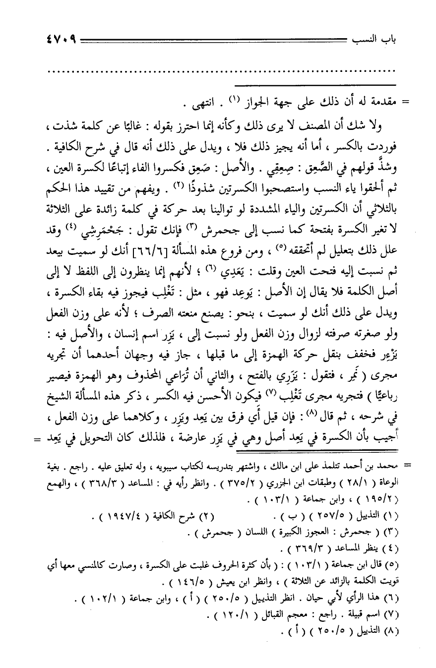 وشذّ قولهم في الصّعق: صعقي. والأصل: صعق فكسروا الفاء إتباعا لكسرة العين، ثم ألحقوا ياء النسب واستصحبوا الكسرتين شذوذا (¬2). ويفهم من تقييد هذا الحكم بالثلاثي أن الكسرتين والياء المشددة لو توالينا بعد حركة في كلمة زائدة على الثلاثة لا تغير الكسرة بفتحة كما نسب إلى جحمرش (¬3) فإنك تقول: جحمرشي (¬4) وقد علل ذلك بتعليل لم أتحققه (¬5)، ومن فروع هذه المسألة [6/ 66] أنك لو سميت بيعد ثم نسبت إليه فتحت العين وقلت: يعدي (¬6)؛ لأنهم إنما ينظرون إلى اللفظ لا إلى أصل الكلمة فلا يقال إن الأصل: يوعد فهو، مثل: تغلب فيجوز فيه بقاء الكسرة، ويدل على ذلك أنك لو سميت، بنحو: يصنع منعته الصرف؛ لأنه على وزن الفعل ولو صغرته صرفته لزوال وزن الفعل ولو نسبت إلى، يزر اسم إنسان، والأصل فيه: