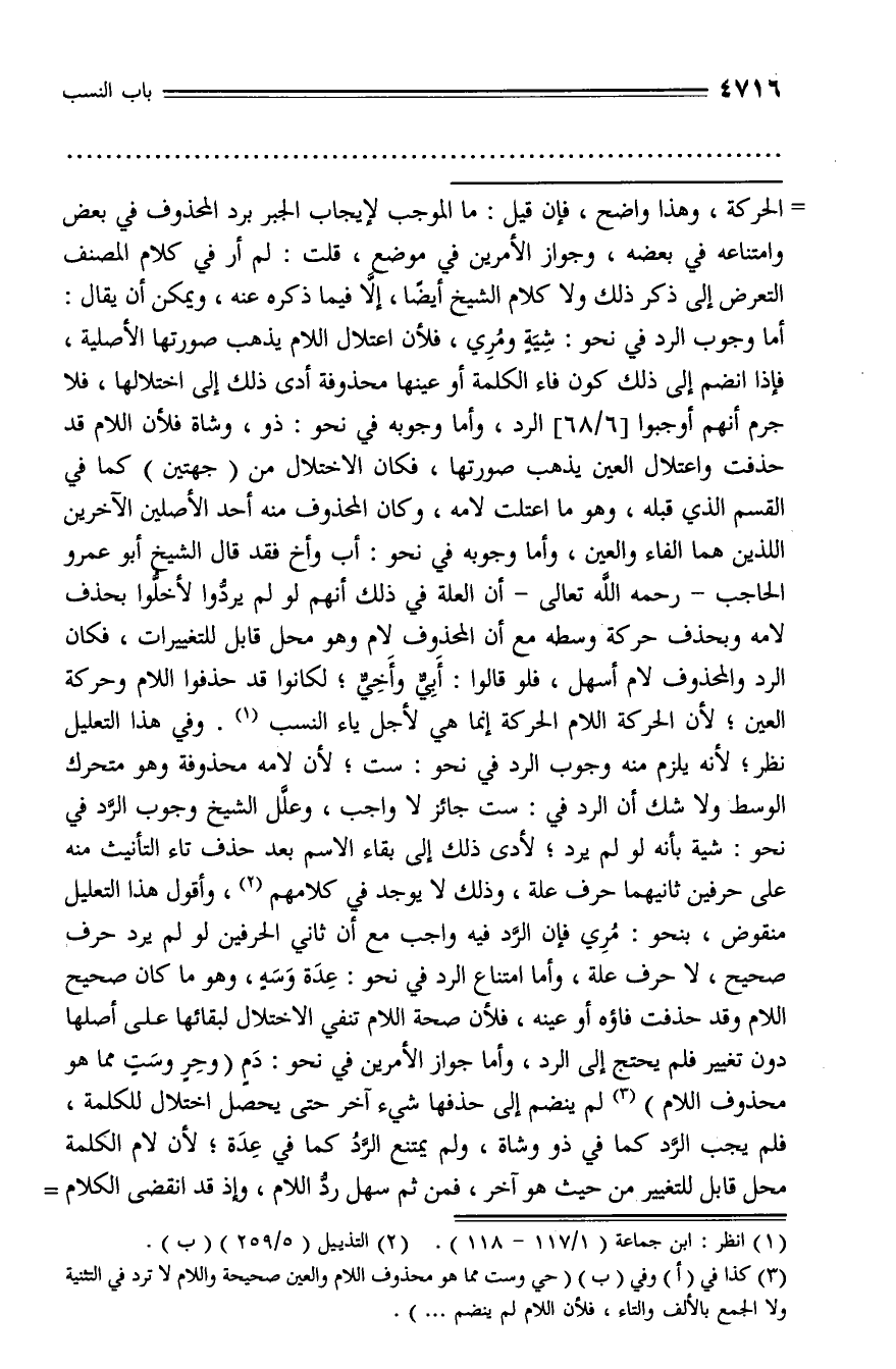 أما وجوب الرد في نحو: شية ومري، فلأن اعتلال اللام يذهب صورتها الأصلية، فإذا انضم إلى ذلك كون فاء الكلمة أو عينها محذوفة أدى ذلك إلى اختلالها، فلا جرم أنهم أوجبوا [6/ 68] الرد، وأما وجوبه في نحو: ذو، وشاة فلأن اللام قد حذفت واعتلال العين يذهب صورتها، فكان الاختلال من (جهتين) كما في القسم الذي قبله، وهو ما اعتلت لامه، وكان المحذوف منه أحد الأصلين الآخرين اللذين هما الفاء والعين، وأما وجوبه في نحو: أب وأخ فقد قال الشيخ أبو عمرو الحاجب - رحمه الله تعالى - أن العلة في ذلك أنهم لو لم يردّوا لأخلّوا بحذف لامه وبحذف حركة وسطه مع أن المحذوف لام وهو محل قابل للتغييرات، فكان الرد والمحذوف لام أسهل، فلو قالوا: أبيّ وأخيّ؛ لكانوا قد حذفوا اللام وحركة العين؛ لأن الحركة اللام الحركة إنما هي لأجل ياء النسب (¬1). وفي هذا التعليل نظر؛ لأنه يلزم منه وجوب الرد في نحو: ست؛ لأن لامه محذوفة وهو متحرك الوسط ولا شك أن الرد في: ست جائز لا واجب، وعلّل الشيخ وجوب الرّد في نحو: شية بأنه لو لم يرد؛ لأدى ذلك إلى بقاء الاسم بعد حذف تاء