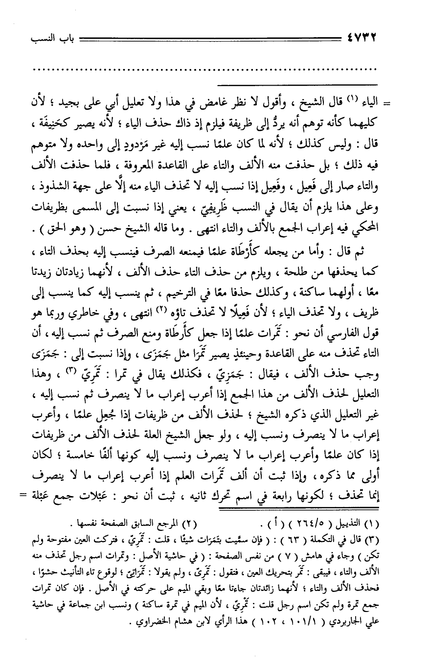 (¬3) قال في التكملة (63): (فإن سمّيت بتمرات شيئا، قلت: تمريّ، فتركت العين مفتوحة ولم تكن) وجاء في هامش (7) من نفس الصفحة: (في حاشية الأصل: وتمرات اسم رجل تحذف منه الألف والتاء، فيبقى: تمر بتحريك العين، فتقول: تمرىّ، ولم يقولا: تمراتىّ؛ لوقوع تاء التأنيث حشوا، فحذف الألف والتاء؛ لأنهما زائدتان جاءتا معا وبقي الميم على حركته في الأصل. فإن كان تمرات جمع تمرة ولم تكن اسم رجل قلت: تمريّ، لأن الميم في تمرة ساكنة) ونسب ابن جماعة في حاشية علي الجاربردي (1/ 101، 102) هذا الرأي لابن هشام الخضراوي.
