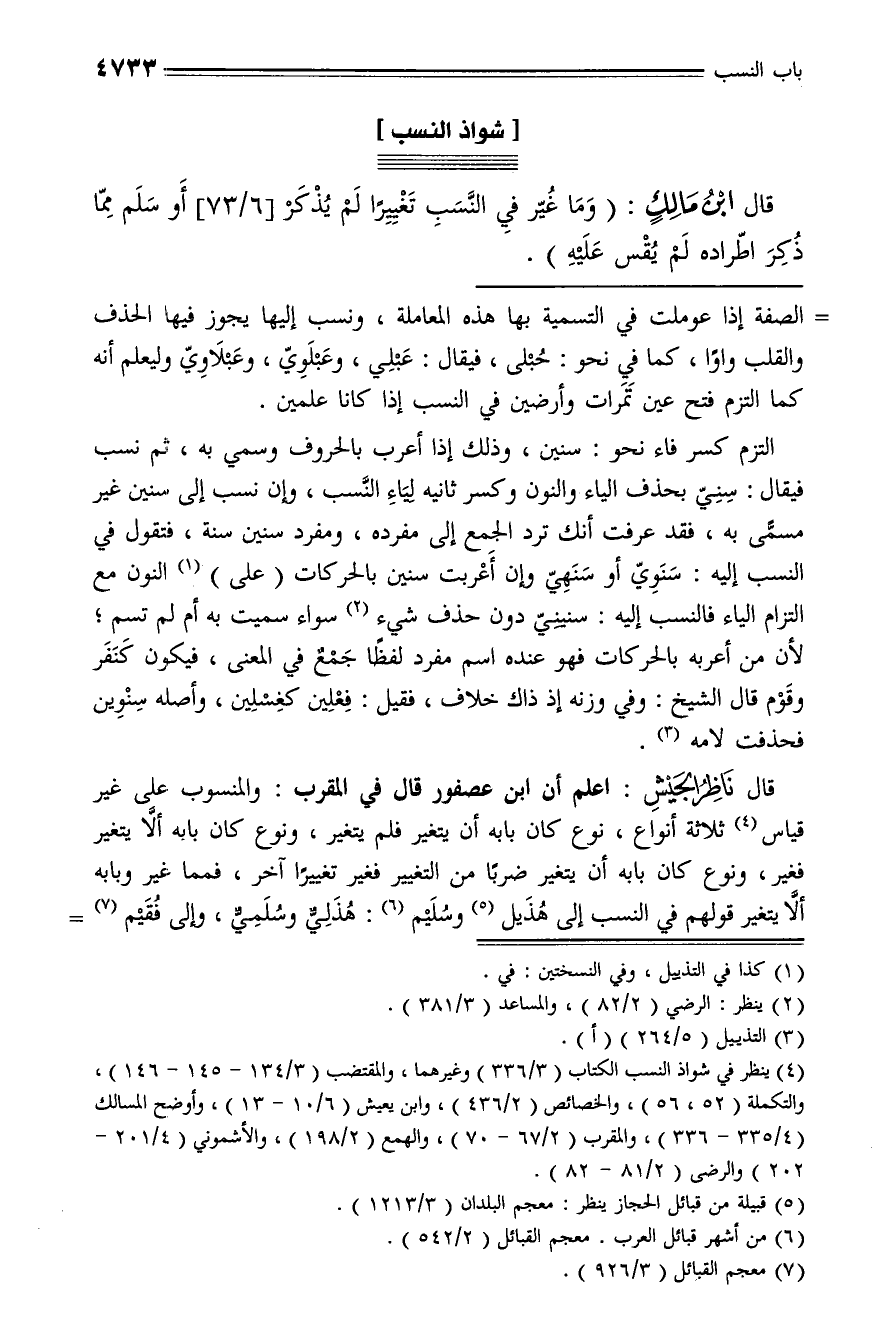 قال ابن مالك: (وما غيّر في النّسب تغييرا لم يذكر [6/ 73] أو سلم ممّا ذكر اطّراده لم يقس عليه).