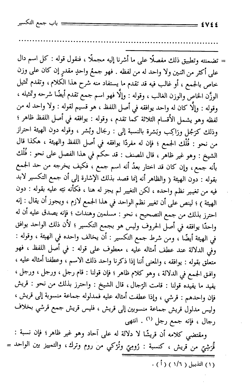 تضمنته وتطبيق ذلك مفصلا على ما أشرنا إليه مجملا، فنقول قوله: كل اسم دال على أكثر من اثنين ولا واحد له من لفظه. فهو جمع واحد مقدر إن كان على وزن خاص بالجمع، أو غالب فيه قد تقدم ما يستفاد منه شرح هذا الكلام، وتقدم تمثيل الوزّن الخاص والوزن الغالب، وقوله: وإلّا فهو اسم جمع تقدم أيضا شرحه وتمثيله، وقوله: وإلّا كان له واحد يوافقه في أصل اللفظ، هو قسيم لقوله: ولا واحد له من لفظه وهو يشمل الأقسام الثلاثة كما تقدم، وقوله: يوافقه في أصل اللفظ ظاهر؛ وذلك كرجل وراكب وبسرة بالنسبة إلى: رجال وبسر، وقوله دون الهيئة احتراز من نحو: فلك الجمع؛ فإن له مفردا يوافقه في أصل اللفظ والهيئة، هكذا قال الشيخ: وهو غير ظاهر، قال المصنف: قد حكم في هذا الفصل على نحو: فلك بأنه جمع، وإن كان قد اختار بعد أنه اسم جمع، فكيف يخرجه من حد الجمع بقوله: دون الهيئة (والظاهر أنه إنما قصد بذلك الإشارة إلى أن جمع التكسير لا بد فيه من تغيير نظم واحده، لكن التغيير لم يجز له هنا، فكأنه نبّه عليه بقوله: دون الهيئة)؛ لينص على أن تغيير نظم الواحد في هذا الجمع لازم، ويجوز أن يقال: إنه احترز بذلك من جمع التصحيح، نحو: مسلمين وهندات؛ فإنه يصدق عليه أن له واحدا يوافقه في أصل الحروف وليس هو بجمع التكسير؛ لأن ذلك الواحد يوافق في الهيئة أيضا، ومن شرط جمع التكسير: أن يخالف واحده في الهيئة، وقوله: