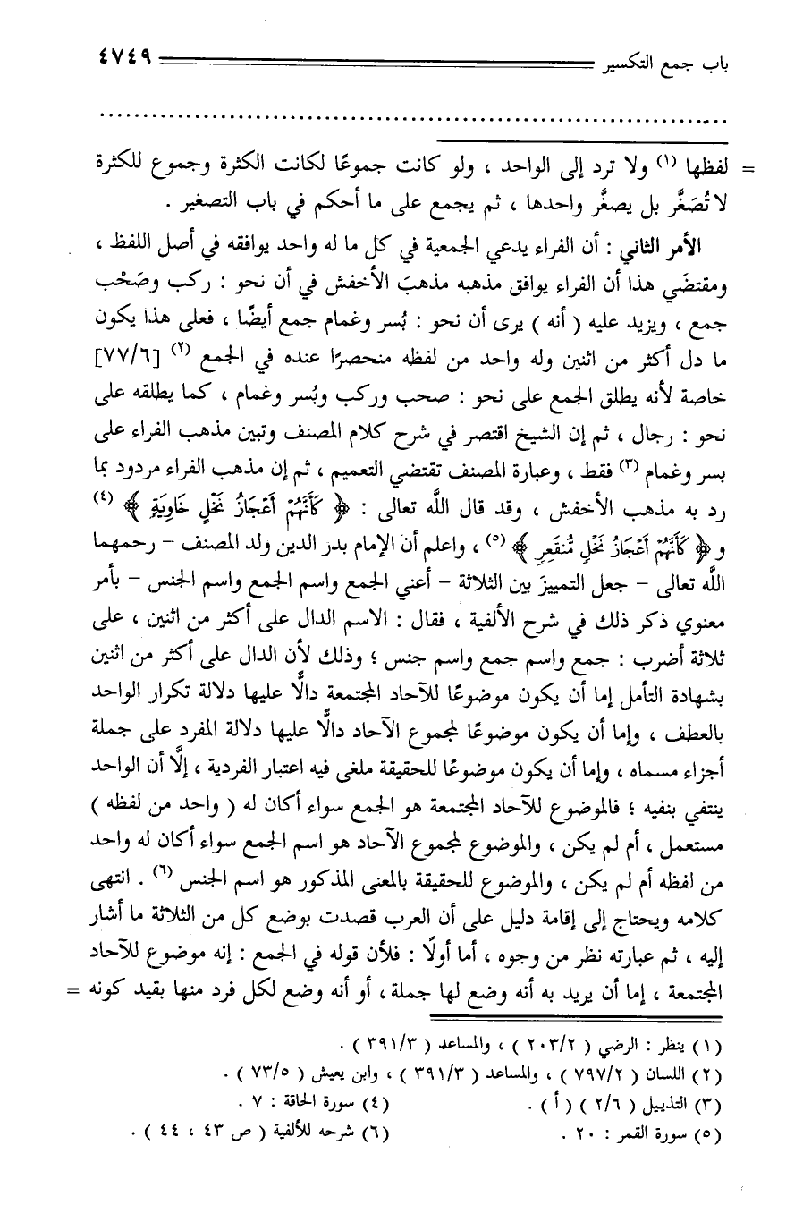 الأمر الثاني: أن الفراء يدعي الجمعية في كل ما له واحد يوافقه في أصل اللفظ، ومقتضي هذا أن الفراء يوافق مذهبه مذهب الأخفش في أن نحو: ركب وصحب جمع، ويزيد عليه (أنه) يرى أن نحو: بسر وغمام جمع أيضا، فعلى هذا يكون ما دل أكثر من اثنين وله واحد من لفظه منحصرا عنده في الجمع (¬2) [6/ 77] خاصة لأنه يطلق الجمع على نحو: صحب وركب وبسر وغمام، كما يطلقه على نحو: رجال، ثم إن الشيخ اقتصر في شرح كلام المصنف وتبين مذهب الفراء على بسر وغمام (¬3) فقط، وعبارة المصنف تقتضي التعميم، ثم إن مذهب الفراء مردود بما رد به مذهب الأخفش، وقد قال الله تعالى: كَأَنَّهُمْ أَعْجازُ نَخْلٍ خاوِيَةٍ (¬4) وكَأَنَّهُمْ أَعْجازُ نَخْلٍ مُنْقَعِرٍ (¬5)، واعلم أن الإمام بدر الدين ولد المصنف - رحمهما الله تعالى - جعل التمييز بين الثلاثة - أعني الجمع واسم الجمع واسم الجنس - بأمر معنوي ذكر ذلك في شرح الألفية، فقال: الاسم الدال على أكثر من اثنين، على ثلاثة أضرب: جمع واسم جمع واسم جنس؛ وذلك لأن الدال على أكثر من اثنين بشهادة التأمل إما أن يكون موضوعا للآحاد المجتمعة دالّا عليها دلالة تكرار الواحد بالعطف، وإما أن يكون موضوعا لمجموع الآحاد دالّا عليها دلالة المفرد على جملة أجزاء مسماه، وإما أن يكون موضوعا للحقيقة ملغى فيه اعتبار الفردية، إلّا أن الواحد ينتفي بنفيه؛ فالموضوع للآحاد المجتمعة هو الجمع سواء أكان له (واحد من لفظه) مستعمل، أم لم يكن، والموضوع لمجموع الآحاد هو اسم الجمع سواء أكان له واحد من لفظه أم لم يكن، والموضوع للحقيقة بالمعنى المذكور هو اسم الجنس (¬6). انتهى كلامه ويحتاج إلى إقامة دليل على أن العرب قصدت بوضع كل من الثلاثة ما أشار إليه، ثم عبارته نظر من وجوه، أما أولا: فلأن قوله في الجمع: إنه موضوع للآحاد المجتمعة، إما أن يريد به أنه وضع لها جملة، أو أنه وضع لكل فرد منها بقيد كونه -