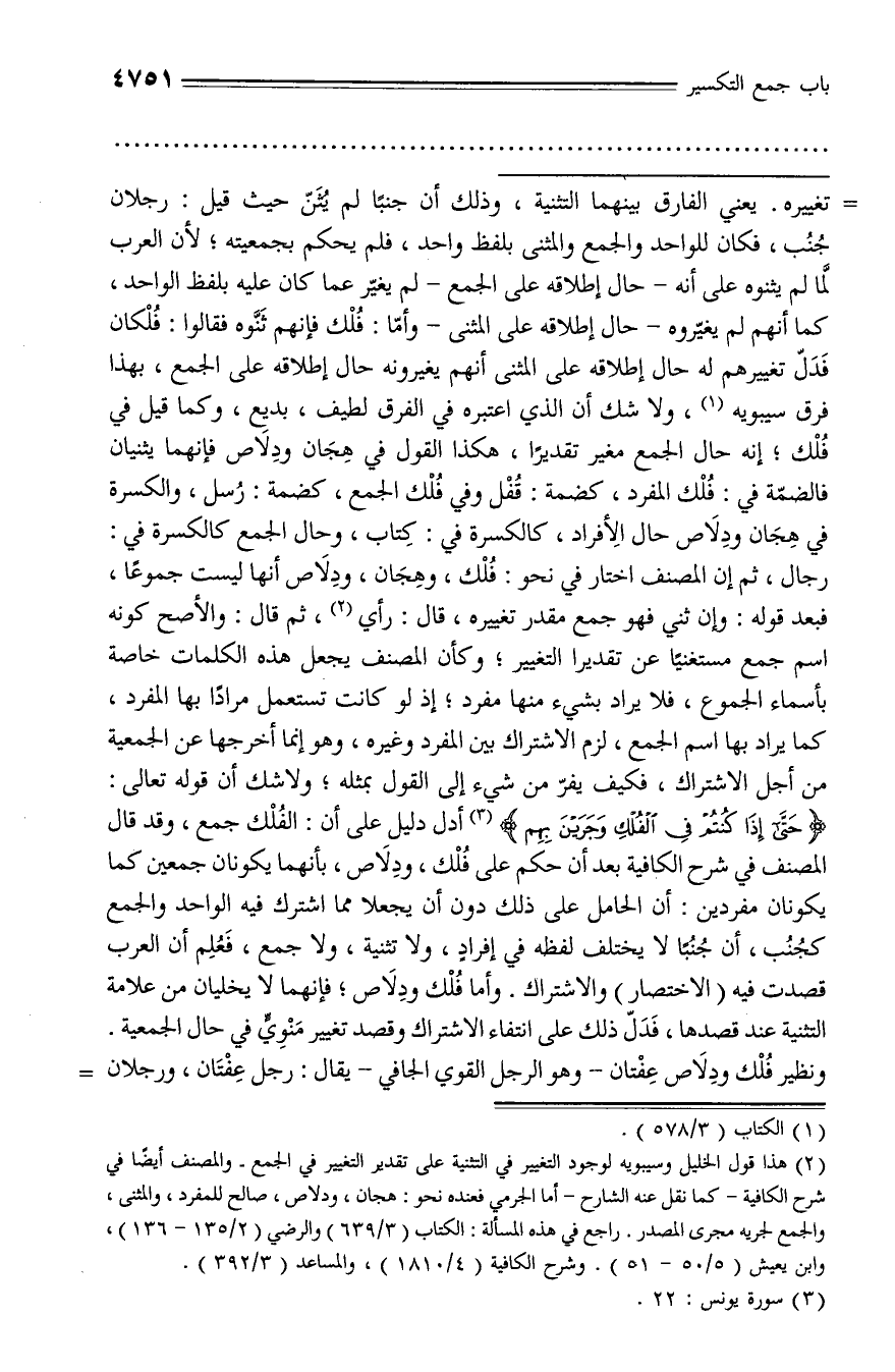 حَتَّى إِذا كُنْتُمْ فِي الْفُلْكِ وَجَرَيْنَ بِهِمْ (¬3) أدل دليل على أن: الفلك جمع، وقد قال المصنف في شرح الكافية بعد أن حكم على فلك، ودلاص، بأنهما يكونان جمعين كما يكونان مفردين: أن الحامل على ذلك دون أن يجعلا مما اشترك فيه الواحد والجمع كجنب، أن جنبا لا يختلف لفظه في إفراد، ولا تثنية، ولا جمع، فعلم أن العرب قصدت فيه (الاختصار) والاشتراك. وأما فلك ودلاص؛ فإنهما لا يخليان من علامة التثنية عند قصدها، فدلّ ذلك على انتفاء الاشتراك وقصد تغيير منويّ في حال الجمعية.