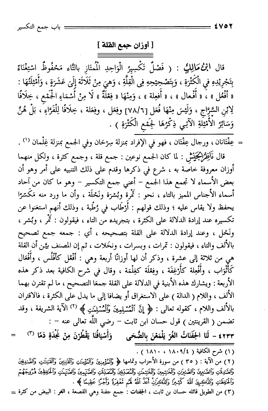 قال ناظر الجيش: لما كان الجمع نوعين: جمع قلة، وجمع كثرة، ولكل منهما أوزان معروفة خاصة به، شرع في ذكرها وقدم على ذلك التنبيه على أمر وهو أن بعض الأسماء لا تجمع هذا الجمع - أعني جمع التكسير - وهو ما كان من آحاد أسماء الأجناس المميز بالتاء، نحو: تمرة وبسرة ونحلة، وأن ما ورد منه مكسّرا يحفظ ولا يقاس عليه؛ وذلك قولهم: أرطاب في رطبة، وذلك أنهم استغنوا عن تكسيره عند إرادة الدلالة على الكثرة، بتجريده من التاء، فيقولون: تمر، وبسر، ونحل، وعند إرادة الدلالة على القلة بتصحيحه، أي: جمعه جمع تصحيح بالألف والتاء، فيقولون: تمرات، وبسرات، ونخلات، ثم إن المصنف بيّن أن القلة هي من ثلاثة إلى عشرة، وذكر أن لها أوزانا أربعة وهي: أفعل كأفلس، وأفعال كأثواب، وأفعلة كأرغفة، وفعلة كغلمة، وقال في شرح الكافية بعد ذكر هذه الأربعة: ويشارك هذه الأبنية في الدلالة على القلة جمعا التصحيح، ما لم تقترن بهما الألف، واللام (الدالة) على الاستغراق أو يضافا إلى ما يدل على الكثرة، فالاقتران بالألف واللام، كقوله تعالى: إِنَّ الْمُسْلِمِينَ وَالْمُسْلِماتِ (¬2) الآية الشريفة، وقد تضمن (القرينتين) قول حسان ابن ثابت - رضي الله تعالى عنه -: