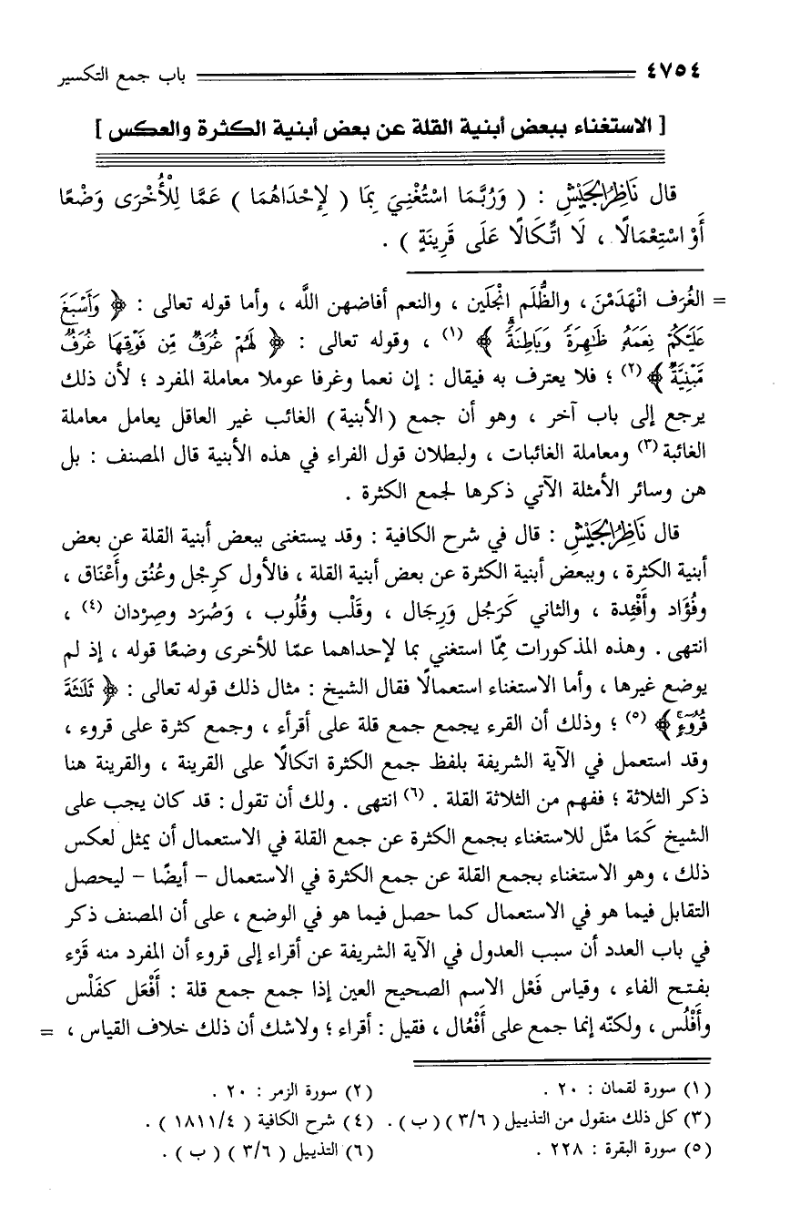 قال ناظر الجيش: قال في شرح الكافية: وقد يستغنى ببعض أبنية القلة عن بعض أبنية الكثرة، وببعض أبنية الكثرة عن بعض أبنية القلة، فالأول كرجل وعنق وأعناق، وفؤاد وأفئدة، والثاني كرجل ورجال، وقلب وقلوب، وصرد وصردان (¬4)، انتهى. وهذه المذكورات ممّا استغني بما لإحداهما عمّا للأخرى وضعا قوله، إذ لم يوضع غيرها، وأما الاستغناء استعمالا فقال الشيخ: مثال ذلك قوله تعالى: ثَلاثَةَ قُرُوءٍ (¬5)؛ وذلك أن القرء يجمع جمع قلة على أقرأء، وجمع كثرة على قروء، وقد استعمل في الآية الشريفة بلفظ جمع الكثرة اتكالا على القرينة، والقرينة هنا ذكر الثلاثة؛ ففهم من الثلاثة القلة. (¬6) انتهى. ولك أن تقول: قد كان يجب على الشيخ كما مثّل للاستغناء بجمع الكثرة عن جمع القلة في الاستعمال أن يمثل لعكس ذلك، وهو الاستغناء بجمع القلة عن جمع الكثرة في الاستعمال - أيضا - ليحصل التقابل فيما هو في الاستعمال كما حصل فيما هو في الوضع، على أن المصنف ذكر في باب العدد أن سبب العدول في الآية الشريفة عن أقراء إلى قروء أن المفرد منه قرء بفتح الفاء، وقياس فعل الاسم الصحيح العين إذا جمع جمع قلة: أفعل كفلس وأفلس، ولكنّه إنما جمع على أفعال، فقيل: أقراء؛ ولا شك أن ذلك خلاف القياس، -