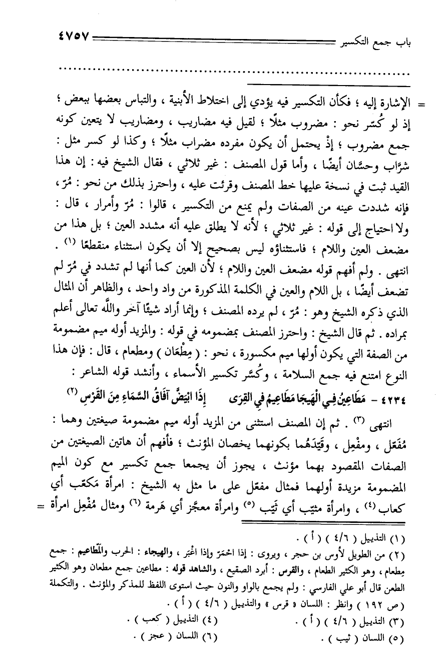 مفعّل، ومفعل، وقيّدهما بكونهما يخصان المؤنث؛ فأفهم أن هاتين الصيغتين من الصفات المقصود بهما مؤنث، يجوز أن يجمعا جمع تكسير مع كون الميم المضمومة مزيدة أولهما فمثال مفعّل على ما مثل به الشيخ: امرأة مكعّب أي كعاب (¬4)، وامرأة مثيّب أي ثيّب (¬5) وامرأة معجّز أي هرمة (¬6) ومثال مفعل امرأة -