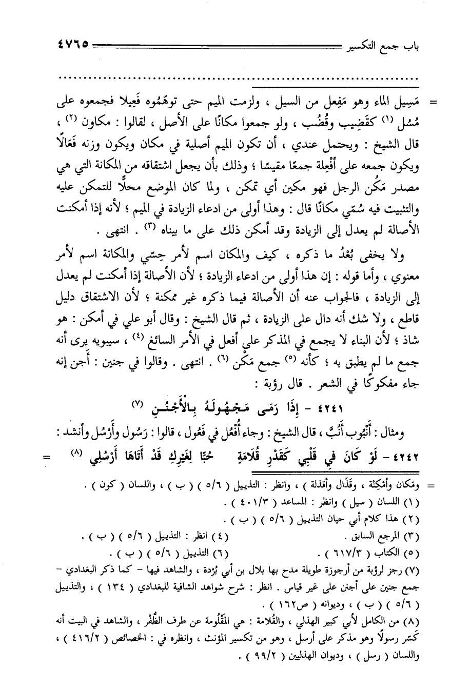 ولا يخفى بعد ما ذكره، كيف والمكان اسم لأمر حسّي والمكانة اسم لأمر معنوي، وأما قوله: إن هذا أولى من ادعاء الزيادة؛ لأن الأصالة إذا أمكنت لم يعدل إلى الزيادة، فالجواب عنه أن الأصالة فيما ذكره غير ممكنة؛ لأن الاشتقاق دليل قاطع، ولا شك أنه دال على الزيادة، ثم قال الشيخ: وقال أبو علي في أمكن: هو شاذ؛ لأن البناء لا يجمع في المذكر على أفعل في الأمر السائغ (¬4)، سيبويه يرى أنه جمع ما لم يطبق به؛ كأنه (¬5) جمع مكن (¬6). انتهى. وقالوا في جنين: أجن إنه جاء مفكوكا في الشعر. قال رؤبة: