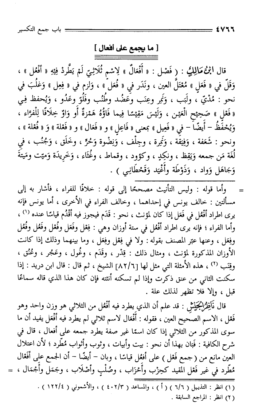 قال ابن مالك: (فصل: «أفعال» لاسم ثلاثيّ لم يطّرد فيه «أفعل»، وقلّ في «فعل» معتلّ العين، وندر في «فعل»، ولزم في «فعل» وغلب في نحو: مديّ، ولبب، ونمر وعنب وعضد وطنب وفلوّ وعدو، ويحفظ في «فعل» صحيح العين، وليس مقيسا فيما فاؤه همزة أو واو خلافا للفرّاء، ويحفظ - أيضا - في «فعيل» بمعنى «فاعل» و «فعال» و «فعلة» و «فعلة»، ونحو: شعفة، وفيقة، ونمرة، وجلف، ونضوة وحرّ، وخلق، وجنب، في لغة من جمعه ويقظ، ونكد، وكؤود، وقماط، وغثاء، وخريدة وميّت وميتة وجاهل وواد، وذوطة وأغيد وقحطاني).