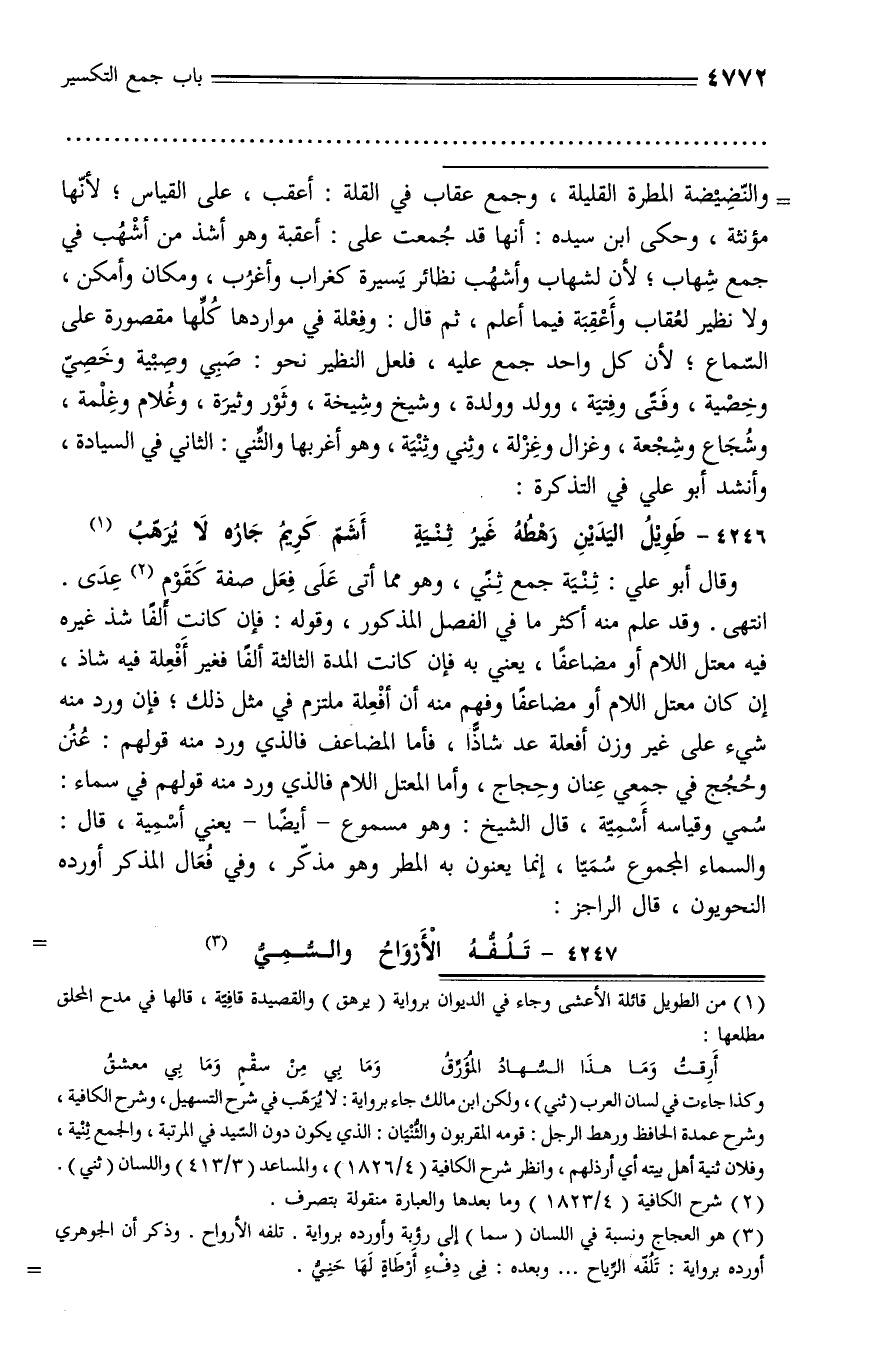 والنّضيضة المطرة القليلة، وجمع عقاب في القلة: أعقب، على القياس؛ لأنّها مؤنثة، وحكى ابن سيده: أنها قد جمعت على: أعقبة وهو أشذ من أشهب في جمع شهاب؛ لأن لشهاب وأشهب نظائر يسيرة كغراب وأغرب، ومكان وأمكن، ولا نظير لعقاب وأعقبة فيما أعلم، ثم قال: وفعلة في مواردها كلّها مقصورة على السّماع؛ لأن كل واحد جمع عليه، فلعل النظير نحو: صبي وصبية وخصيّ وخصية، وفتى وفتية، وولد وولدة، وشيخ وشيخة، وثور وثيرة، وغلام وغلمة، وشجاع وشجعة، وغزال وغزلة، وثني وثنية، وهو أغربها والثّني: الثاني في السيادة، وأنشد أبو علي في التذكرة:
