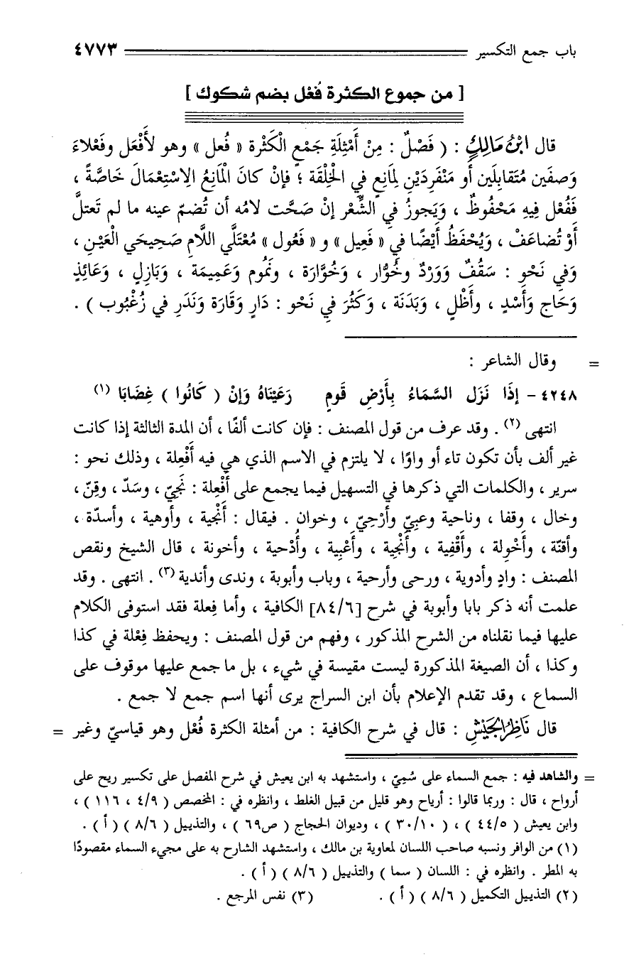 قال ابن مالك: (فصل: من أمثلة جمع الكثرة «فعل» وهو لأفعل وفعلاء وصفين متقابلين أو منفردين لمانع في الخلقة؛ فإن كان المانع الاستعمال خاصّة، ففعل فيه محفوظ، ويجوز في الشّعر إن صحّت لامه أن تضمّ عينه ما لم تعتلّ أو تضاعف، ويحفظ أيضا في «فعيل» و «فعول» معتلّي اللّام صحيحي العين، وفي نحو: سقف وورد وخوّار، وخوّارة، ونموم وعميمة، وبازل، وعائذ وحاج وأسد، وأظل، وبدنة، وكثر في نحو: دار وقارة وندر في زغبوب).