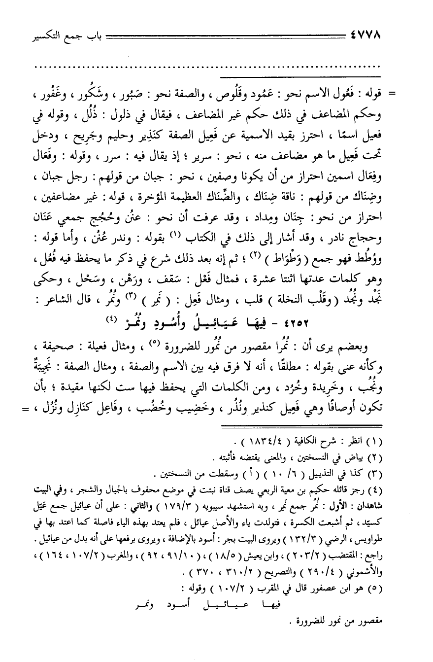 قوله: فعول الاسم نحو: عمود وقلوص، والصفة نحو: صبور، وشكور، وغفور، وحكم المضاعف في ذلك حكم غير المضاعف، فيقال في ذلول: ذلل، وقوله في فعيل اسما، احترز بقيد الاسمية عن فعيل الصفة كنذير وحليم وجريح، ودخل تحت فعيل ما هو مضاعف منه، نحو: سرير؛ إذ يقال فيه: سرر، وقوله: وفعال وفعال اسمين احتراز من أن يكونا وصفين، نحو: جبان من قولهم: رجل جبان، وضناك من قولهم: ناقة ضناك، والضّناك العظيمة المؤخرة، قوله: غير مضاعفين، احتراز من نحو: جنان ومداد، وقد عرفت أن نحو: عنن وحجج جمعي عنان وحجاج نادر، وقد أشار إلى ذلك في الكتاب (¬1) بقوله: وندر عنن، وأما قوله:
