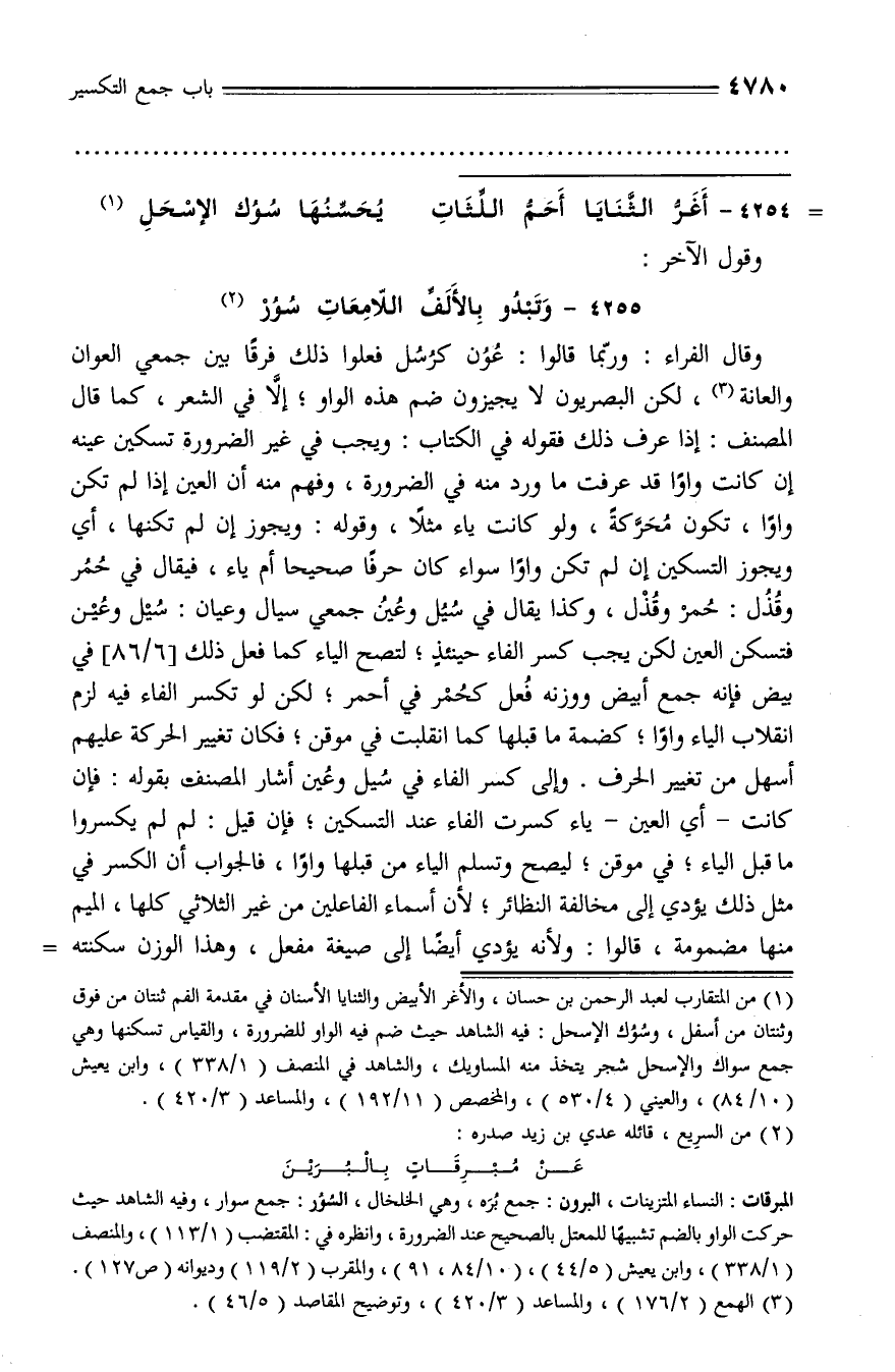 فيه الشاهد حيث ضم فيه الواو للضرورة، والقياس تسكنها وهي جمع سواك والإسحل شجر يتخذ منه المساويك، والشاهد في المنصف (1/ 338)، وابن يعيش (10/ 84)، والعيني (4/ 530)، والمخصص (11/ 192)، والمساعد (3/ 420).