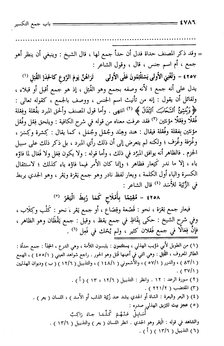 وَيُنْشِئُ السَّحابَ الثِّقالَ (¬2) انتهى. وأما قول المصنف وألحق المبرد بفعلة وفعلة فعلا وفعلا مؤنثين (¬3) فقد عرفت معناه من قوله في شرح الكافية: ويلحق فعل وفعل مؤنثين بفعلة وفعلة فيقال: هند وهند وجمل وجمل، كما يقال: كسرة وكسر، وغرفة وغرف؛ ولكنه لم يتعرض إلى أن ذلك رأي المبرد، بل ذكر ذلك على سبيل الجزم. فالظاهر أنه يوافق المبرّد في ذلك، وأما قوله: ولا يكون فعل ولا فعال لما فاؤه ياء، إلا ما ندر كيعار فظاهر؛ وإنما كان الأمر فيما فاؤه ياء كذلك؛ لاستثقال الكسرة والياء أول الكلمة، ويعار لفظ نادر وهو جمع يعرة ويعر، وهو الجدي يربط في الزّبية للأسد (¬4) قال الشاعر: