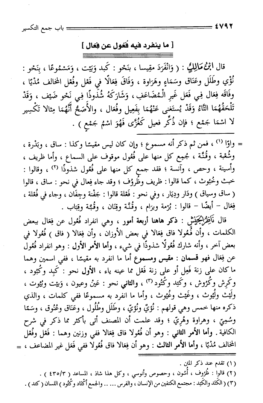 قال ناظر الجيش: ذكر هاهنا أربعة أمور، وهي انفراد فعول عن فعال ببعض الكلمات، وأن فعولا فاق فعالا في بعض الأوزان، وأن فعالا (فاق) فعولا في بعض آخر، وأنه شارك فعولا شذوذا في شيء، وأما الأمر الأول: وهو انفراد فعول عن فعال فهو قسمان: مقيس ومسموع أما ما انفرد به مقيسا، ففي اسمين وهما ما كان على زنة فعل أو على زنة فعل مما عينه ياء، الأول نحو: كبد وكبود، وكرش وكروش، وكتد وكتود (¬3)، والثاني نحو: عين وعيون، وبيت وبيوت، وليث وليوث، وغيث وغيوث، وأما ما انفرد به مسموعا ففي كلمات، والذي ذكره منها