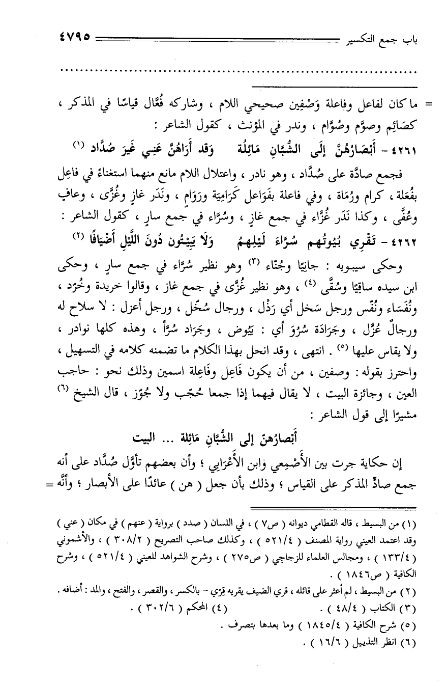 فجمع صادّة على صدّاد، وهو نادر، واعتلال اللام مانع منهما استغناء في فاعل بفعلة، كرام ورماة، وفي فاعلة بفواعل كرامية وروام، وندر غاز وغزّى، وعاف وعفّى، وكذا ندر غزّاء في جمع غاز، وسرّاء في جمع سار، كقول الشاعر: