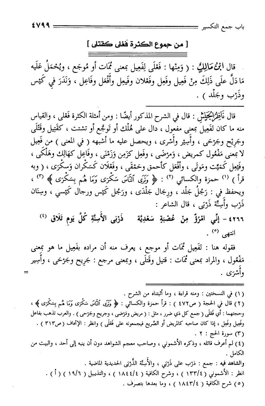 قال ناظر الجيش: قال في الشرح المذكور أيضا: ومن أمثلة الكثرة فعلى، والقياس منه ما كان لفعيل بمعنى مفعول، دال على هلك أو توجّع أو تشتت، كقتيل وقتلى وجريح وجرحى، وأسير وأسرى، ويحصل عليه ما أشبهه (في المعنى) من فعيل لا بمعنى مفعول كمريض، ومرضى، وفعل كزمن وزمنى، وفاعل كهالك وهلكى، وفيعل كميّت وموتى، وأفعل كأحمق وحمقى، وفعلان كسكران وسكرى، (وبه قرأ) (¬1) حمزة والكسائي (¬2): وترى الناس سكارى وما هم بسكارى (¬3)، ويحفظ في: رجل جلد، ورجال جلدى، ورجل كيس ورجال كيسي، وسنان