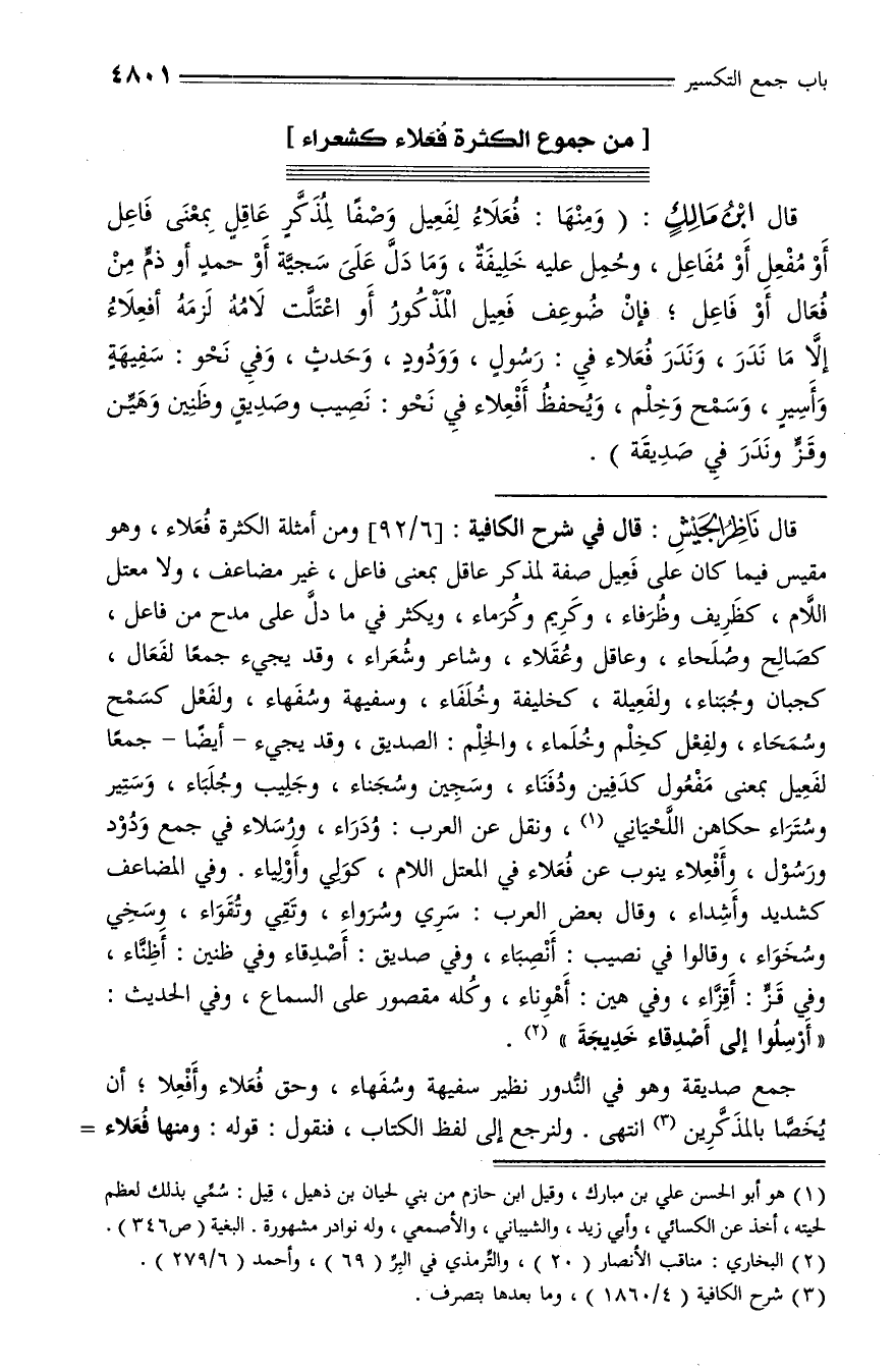 قال ناظر الجيش: قال في شرح الكافية: [6/ 92] ومن أمثلة الكثرة فعلاء، وهو مقيس فيما كان على فعيل صفة لمذكر عاقل بمعنى فاعل، غير مضاعف، ولا معتل اللّام، كظريف وظرفاء، وكريم وكرماء، ويكثر في ما دلّ على مدح من فاعل، كصالح وصلحاء، وعاقل وعقلاء، وشاعر وشعراء، وقد يجيء جمعا لفعال، كجبان وجبناء،