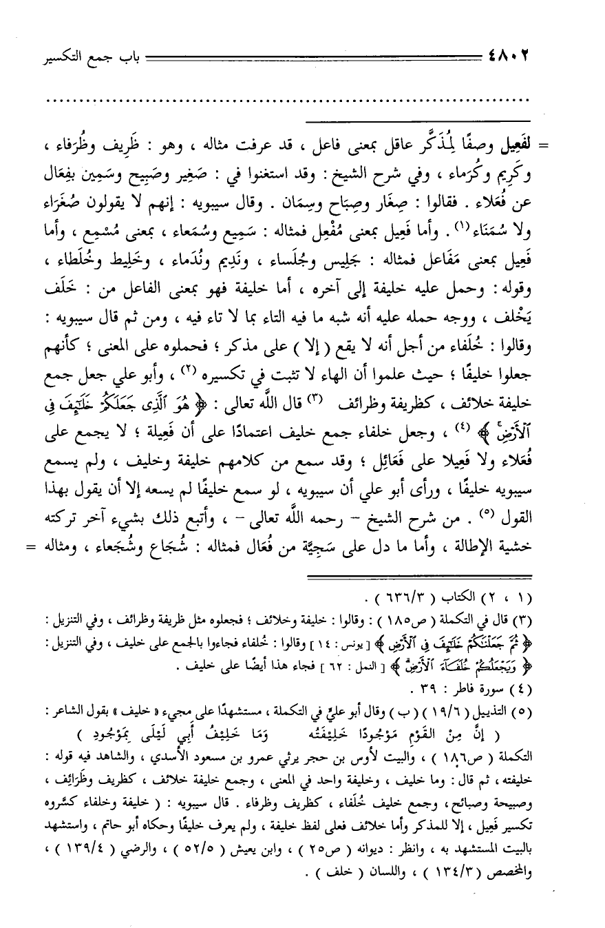 (¬3) قال في التكملة (ص 185): وقالوا: خليفة وخلائف؛ فجعلوه مثل ظريفة وظرائف، وفي التنزيل: