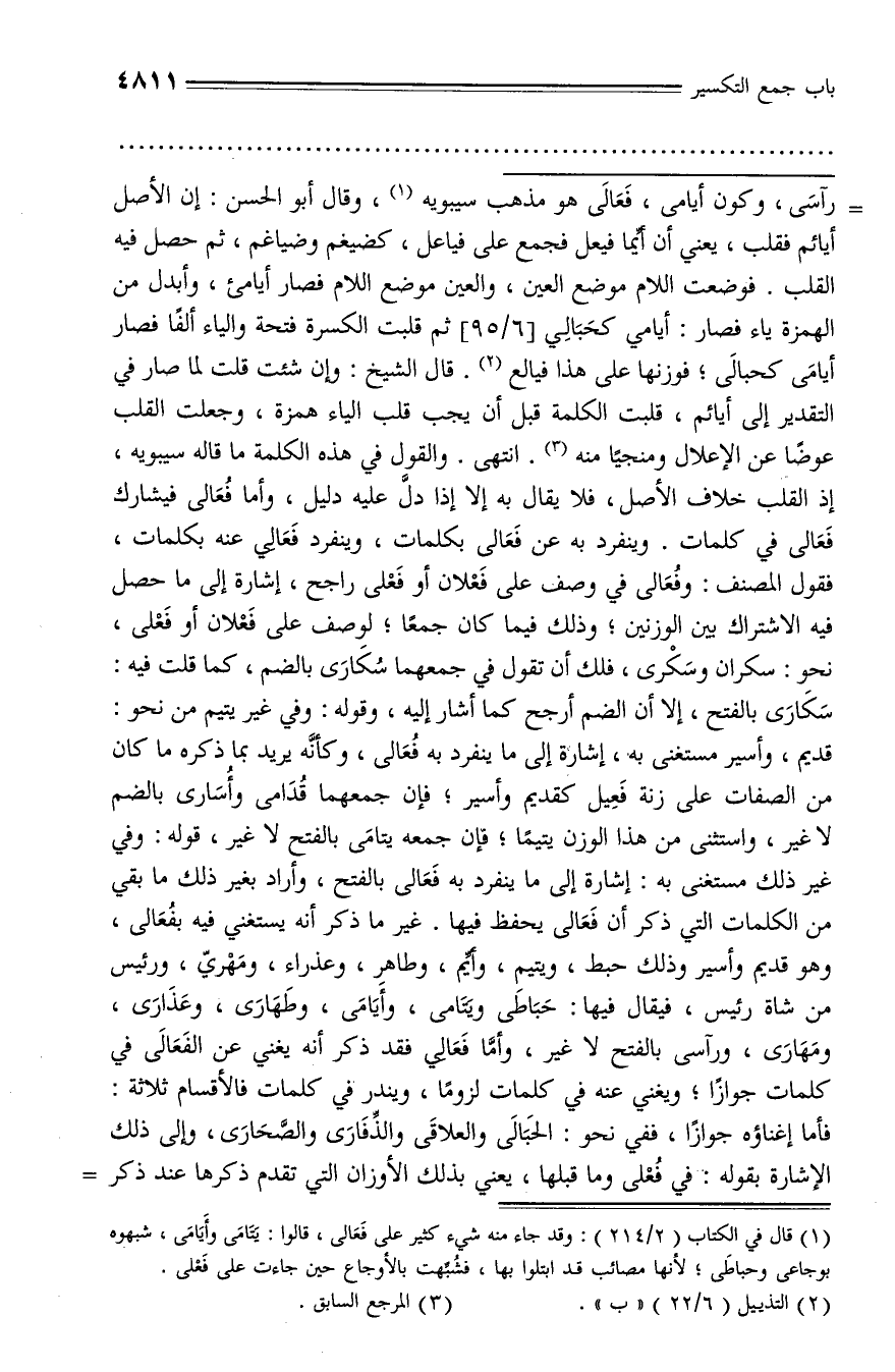 (¬1) قال في الكتاب (2/ 214): وقد جاء منه شيء كثير على فعالى، قالوا: يتامى وأيامى، شبهوه بوجاعى وحباطى؛ لأنها مصائب قد ابتلوا بها، فشبّهت بالأوجاع حين جاءت على فعلى.