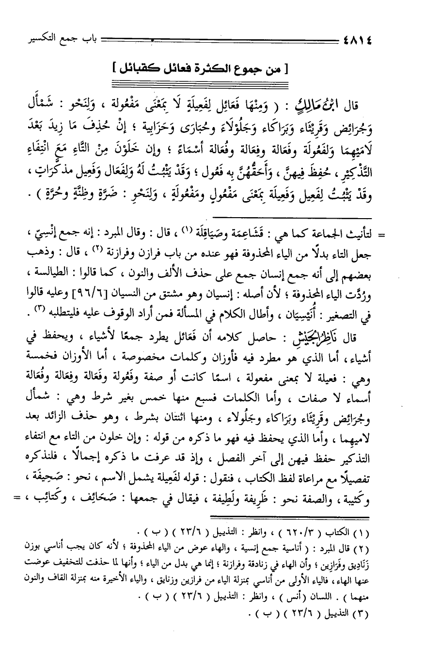 (¬2) قال المبرد: (أناسية جمع إنسية، والهاء عوض من الياء المحذوفة؛ لأنه كان يجب أناسي بوزن زناديق وفرازين؛ وأن الهاء في زنادقة وفرازنة؛ إنما هي بدل من الياء؛ وأنها لما حذفت للتخفيف عوضت عنها الهاء، فالياء الأولى من أناسي بمنزلة الياء من فرازين وزنايق، والياء الأخيرة منه بمنزلة القاف والنون منهما). اللسان (أنس)، وانظر: التذييل (6/ 23) (ب).