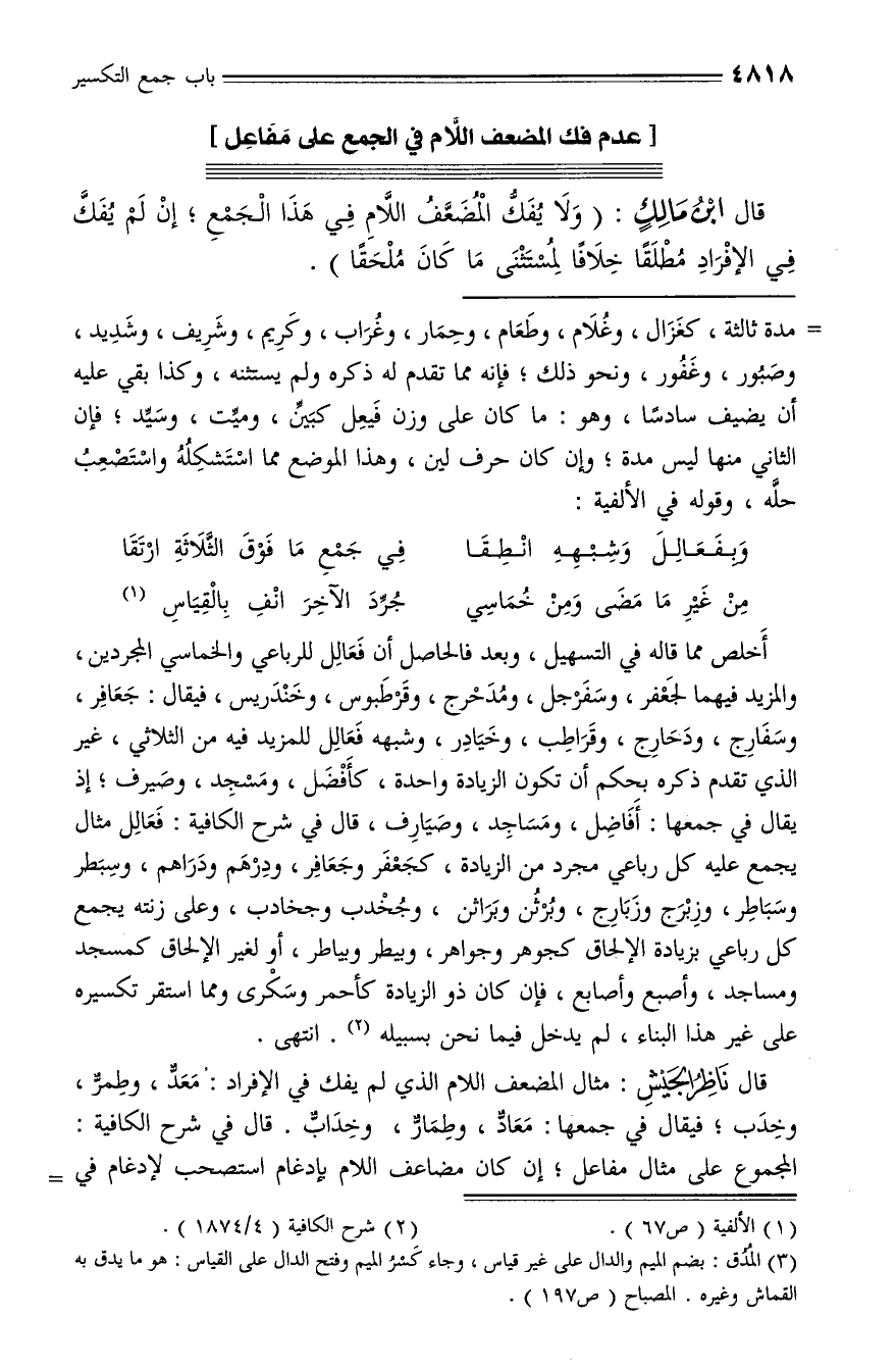 قال ابن مالك: (ولا يفكّ المضعّف اللّام في هذا الجمع؛ إن لم يفكّ في الإفراد مطلقا خلافا لمستثنى ما كان ملحقا).