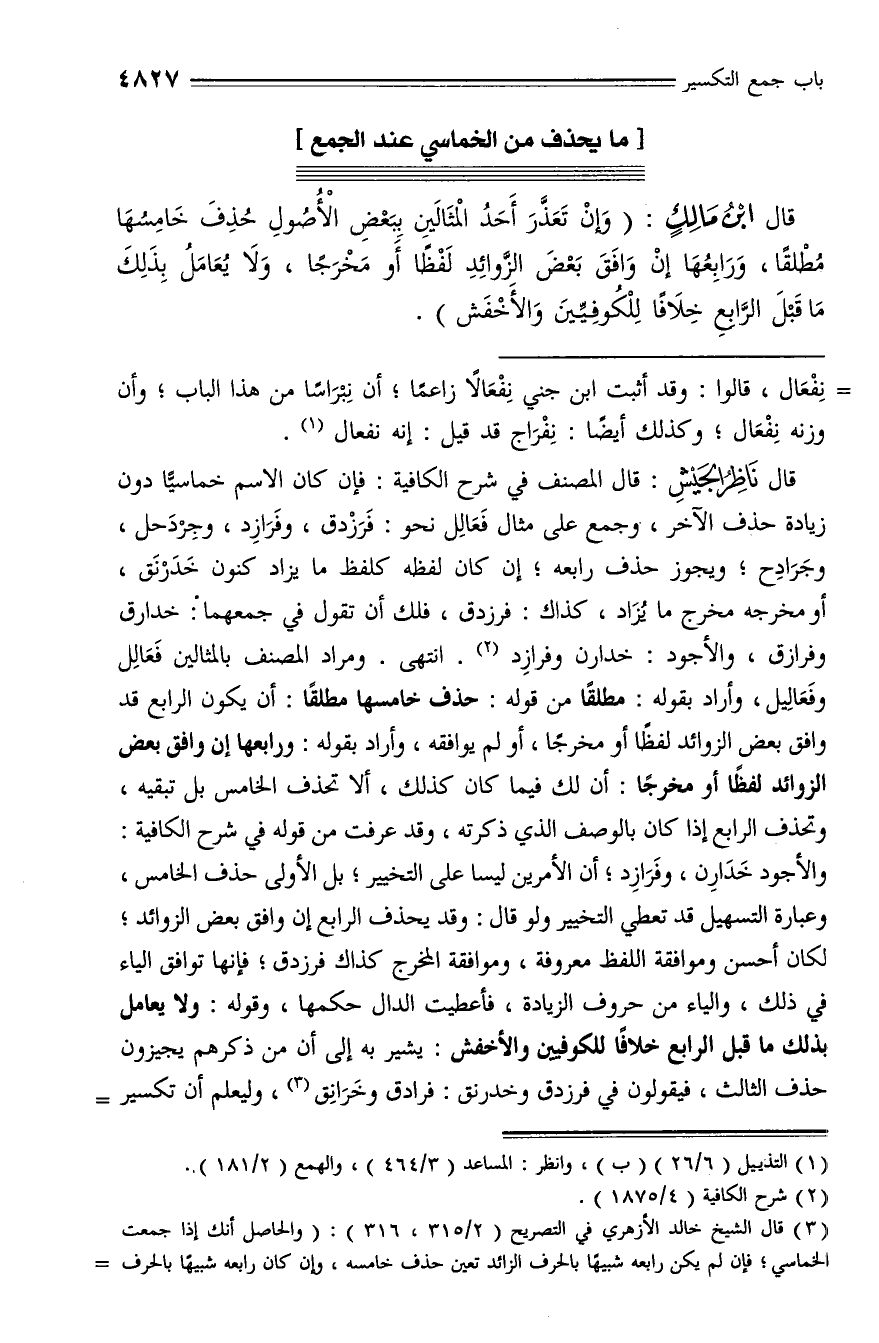 (¬3) قال الشيخ خالد الأزهري في التصريح (2/ 315، 316): (والحاصل أنك إذا جمعت الخماسي؛ فإن لم يكن رابعه شبيها بالحرف الزائد تعين حذف خامسه، وإن كان رابعه شبيها بالحرف -