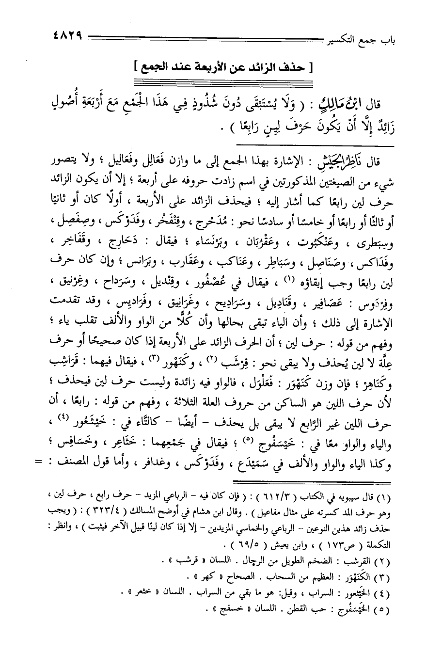 قال ابن مالك: (ولا يستبقى دون شذوذ في هذا الجمع مع أربعة أصول زائد إلّا أن يكون حرف لين رابعا).
