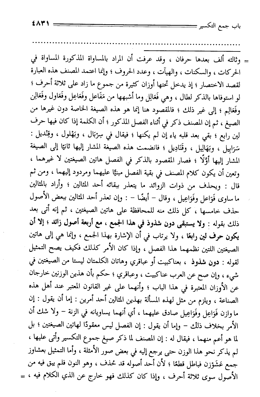 سرابيل، وبهاليل، وقناديل؛ فانضمت هذه الصيغة المشار إليها ثانيا إلى الصيغة المشار إليها أوّلا؛ فصار المقصود بالذكر في الفصل هاتين الصيغتين لا غيرهما، وتعين أن يكون كلام المصنف في بقية الفصل مبنيّا عليهما ومردود إليهما، ومن ثم قال: ويحذف من ذوات الزوائد ما يتعذر ببقائه أحد المثالين؛ وأراد بالمثالين ما ساوى فواعل وفواعيل، وقال - أيضا -: وإن تعذر أحد المثالين ببعض الأصول حذف خامسها، كل ذلك منه للمحافظة على هاتين الصيغتين، ثم إنه أتى بعد ذلك بقوله: ولا يستبقى دون شذوذ في هذا الجمع، مع أربعة أصول زائد؛ إلا أن يكون حرف لين رابعا، ولا يرتاب في أن الإشارة بهذا الجمع، وإنما هي إلى هاتين الصيغتين اللتين نظمهما هذا الفصل، وإذا كان الأمر كذلك فكيف يصح التمثيل لقوله: دون شذوذ، بعناكبيت أو عباقري وهاتان الكلمتان ليستا من الصيغتين في شيء، وإن صح عن العرب عناكبيت، وعباقري؛ حكم بأن هذين الوزنين خارجان عن الأوزان المعتبرة في هذا الباب؛ وأنهما على غير القانون المعتبر عند أهل هذه الصناعة، ويلزم من